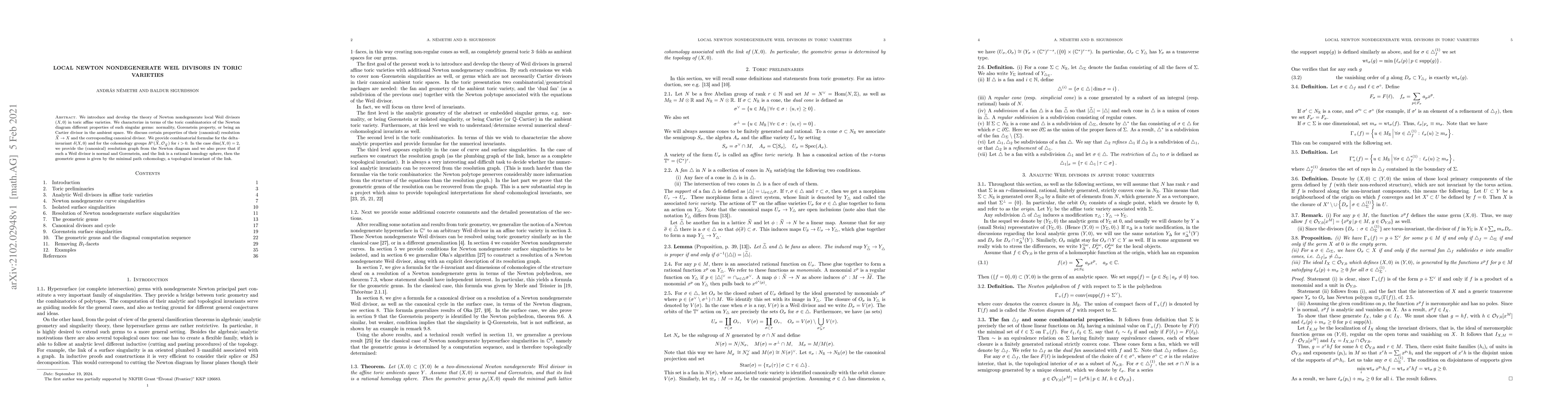 This paper develops the theory of Newton nondegenerate local Weil divisors in toric affine varieties, characterizing properties like normality and Gorenstein property through toric combinatorics. It provides combinatorial formulas for delta-invariants and cohomology groups, and in the case of dimension two, relates the geometric genus to minimal path cohomology of the link.