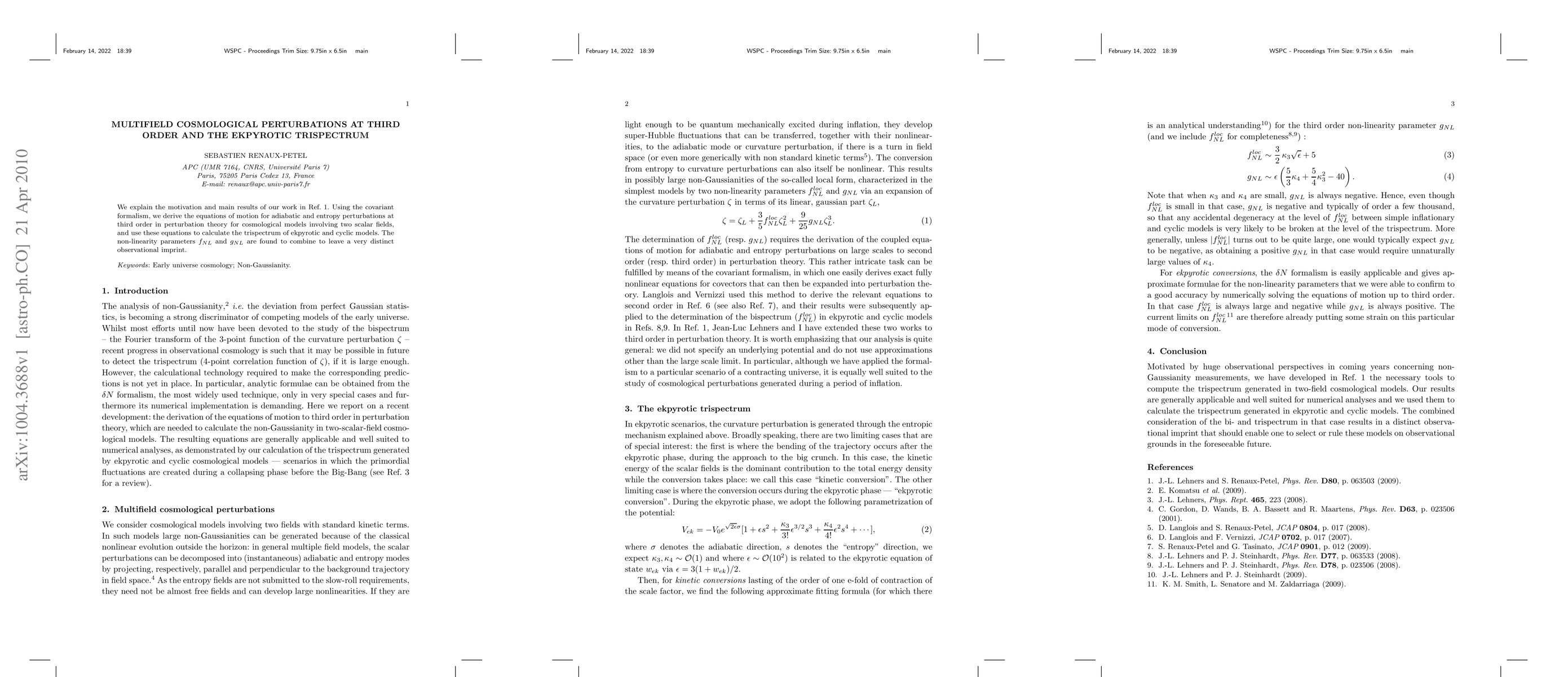 We explain the motivation and main results of our work in reference arXiv:0906.0530 [hep-th]. Using the covariant formalism, we derive the equations of motion for adiabatic and entropy perturbations at third order in perturbation theory for cosmological models involving two scalar fields, and use these equations to calculate the trispectrum of ekpyrotic and cyclic models. The non-linearity parameters $f_{NL}$ and $g_{NL}$ are found to combine to leave a very distinct observational imprint.