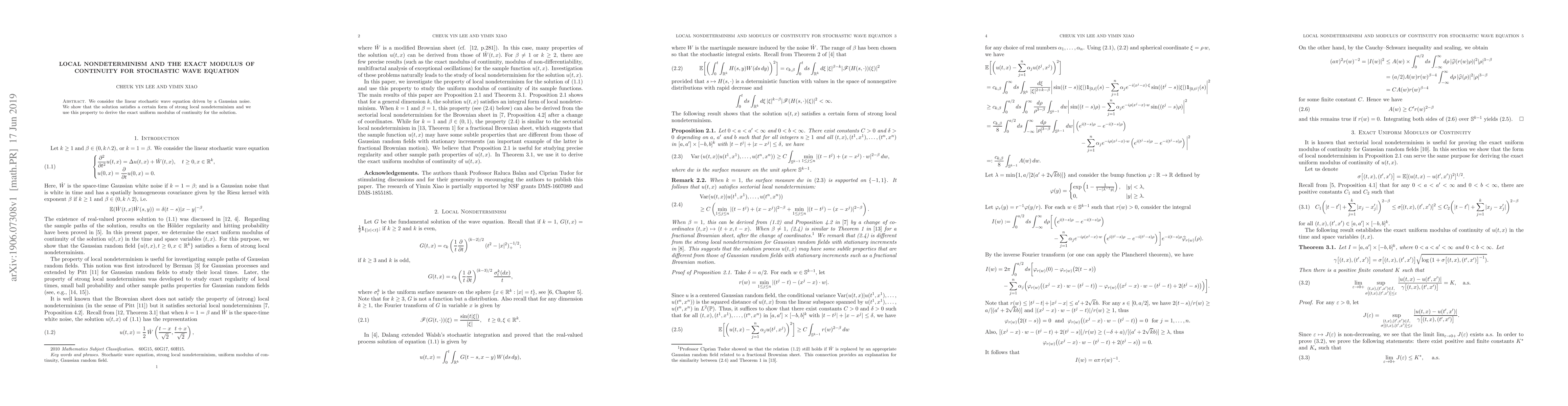This paper investigates the linear stochastic wave equation influenced by Gaussian noise, demonstrating strong local nondeterminism in the solution. It leverages this property to determine the exact uniform modulus of continuity for the solution.