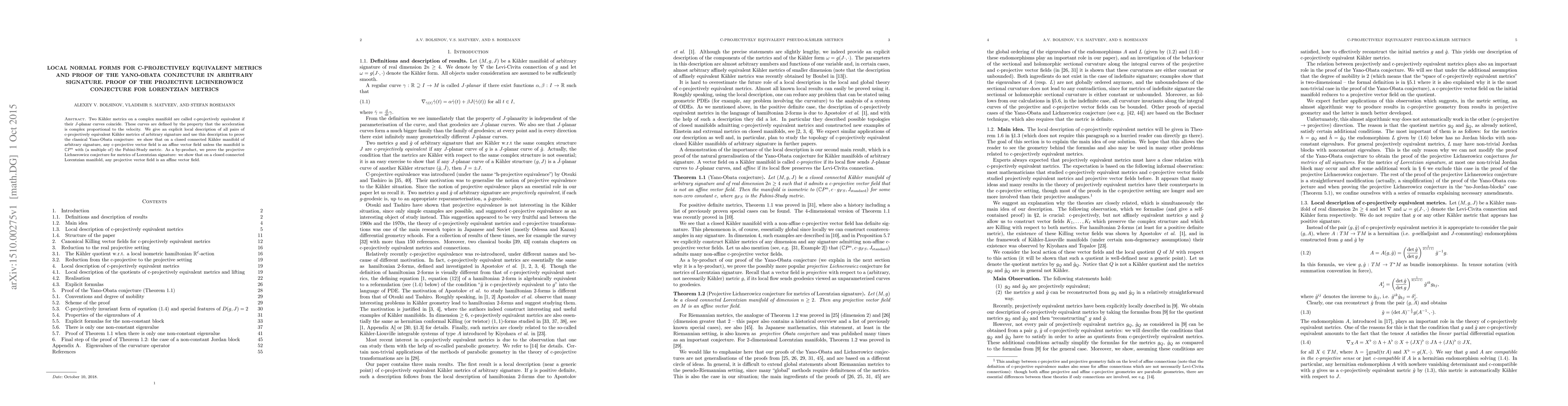 This paper provides an explicit local description of c-projectively equivalent Kähler metrics and proves the Yano-Obata conjecture, showing that c-projective vector fields are affine unless on a specific complex projective space. Additionally, it verifies the projective Lichnerowicz conjecture for Lorentzian metrics.