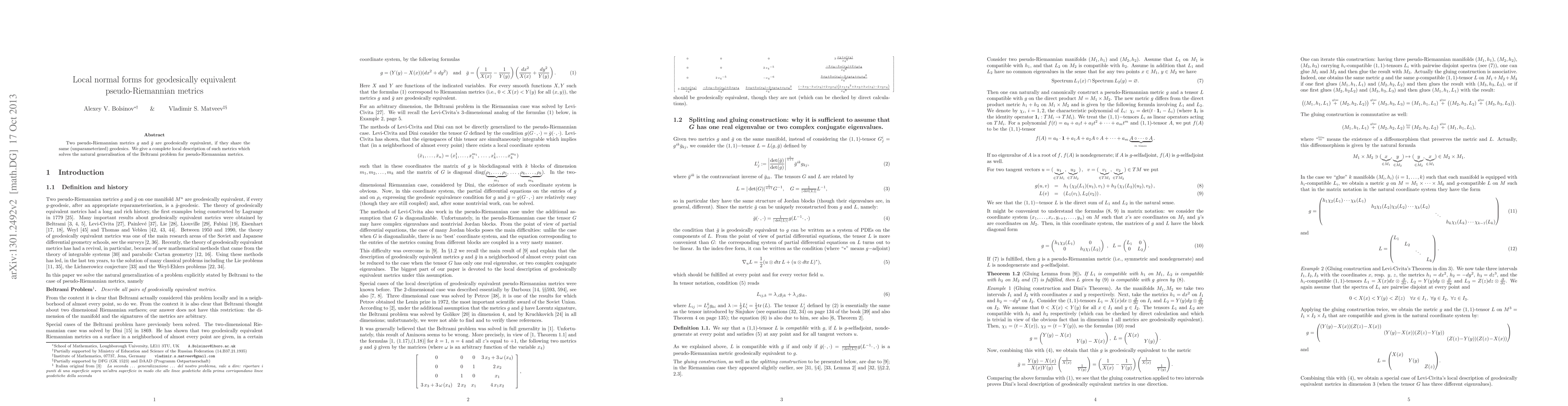 This paper explores geodesic equivalence of pseudo-Riemannian metrics, providing a complete local description of metrics that share the same geodesics. It solves the generalized Beltrami problem for these metrics.