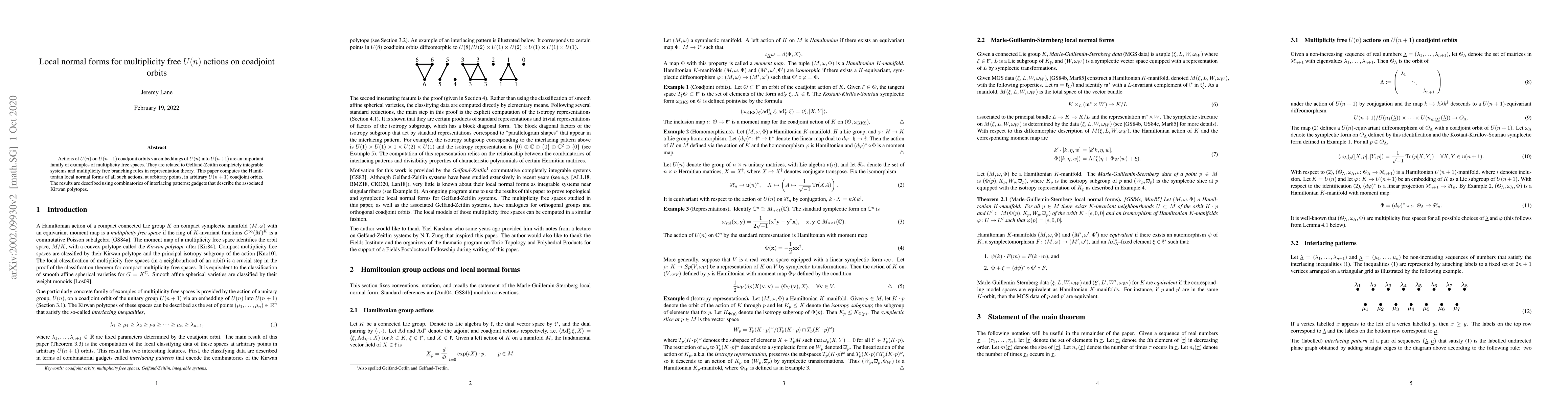 This paper determines the Hamiltonian local normal forms for multiplicity free $U(n)$ actions on $U(n+1)$ coadjoint orbits, utilizing combinatorial interlacing patterns and associated Kirwan polytopes to describe the results. The findings connect to Gelfand-Zeitlin integrable systems and representation theory branching rules.