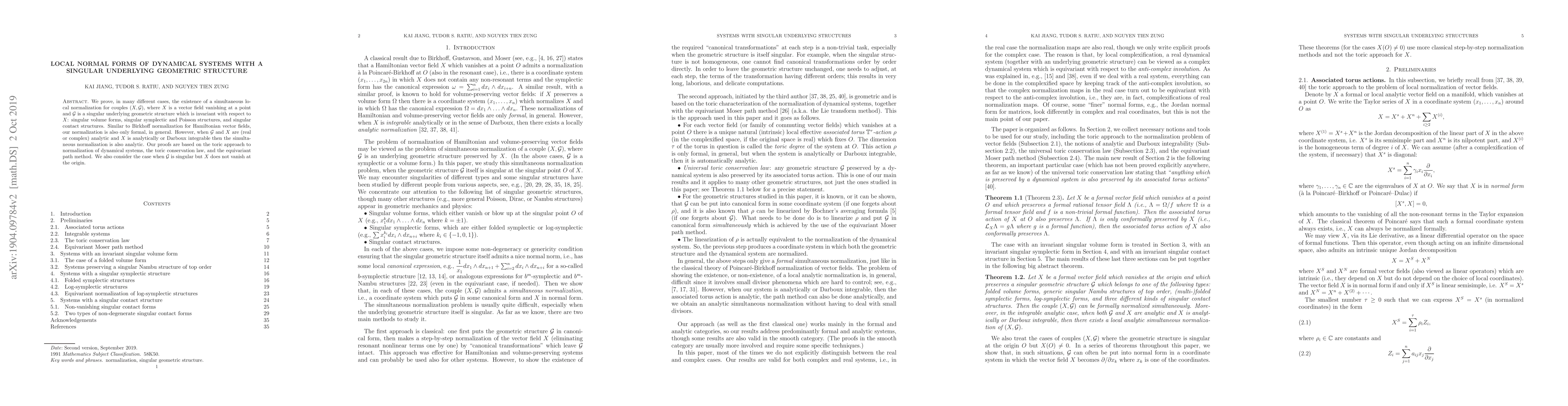 In this paper we prove the existence of a simultaneous local normalization for couples $(X,\mathcal{G})$, where $X$ is a vector field which vanishes at a point and $\mathcal{G}$ is a singular underlying geometric structure which is invariant with respect to $X$, in many different cases: singular volume forms, singular symplectic and Poisson structures, and singular contact structures. Similarly to Birkhoff normalization for Hamiltonian vector fields, our normalization is also only formal, in general. However, when $\mathcal{G}$ and $X$ are (real or complex) analytic and $X$ is analytically integrable or Darboux-integrable then our simultaneous normalization is also analytic. Our proofs are based on the toric approach to normalization of dynamical systems, the toric conservation law, and the equivariant path method. We also consider the case when $\mathcal{G}$ is singular but $X$ does not vanish at the origin.