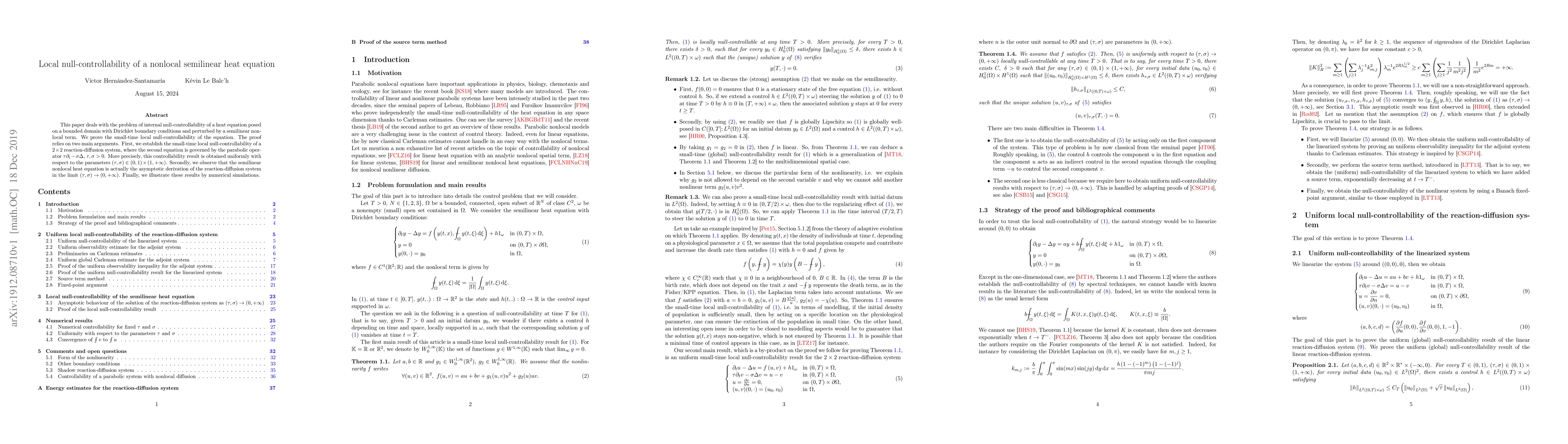 This paper proves the small-time local null-controllability of a nonlocal semilinear heat equation using a reaction-diffusion system as a foundational model. The controllability is shown through the uniform small-time null-controllability of the reaction-diffusion system and the asymptotic derivation of the nonlocal equation.