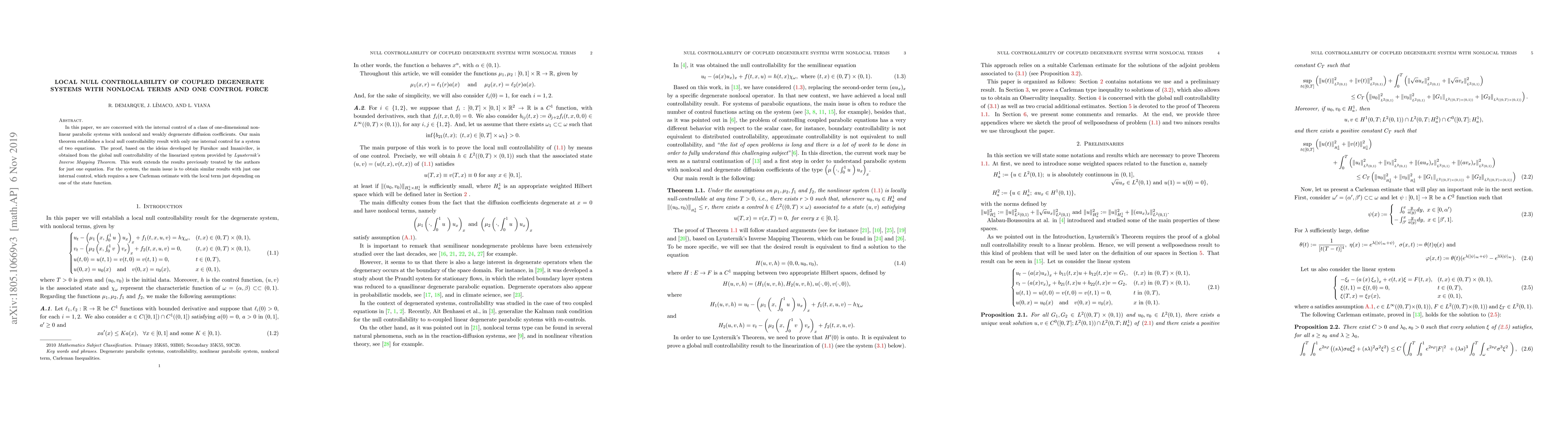 This paper investigates local null controllability for a class of one-dimensional nonlinear parabolic systems with nonlocal and weakly degenerate diffusion coefficients, using a single internal control. The authors establish this result using a new Carleman estimate and extend previous findings for single-equation systems.