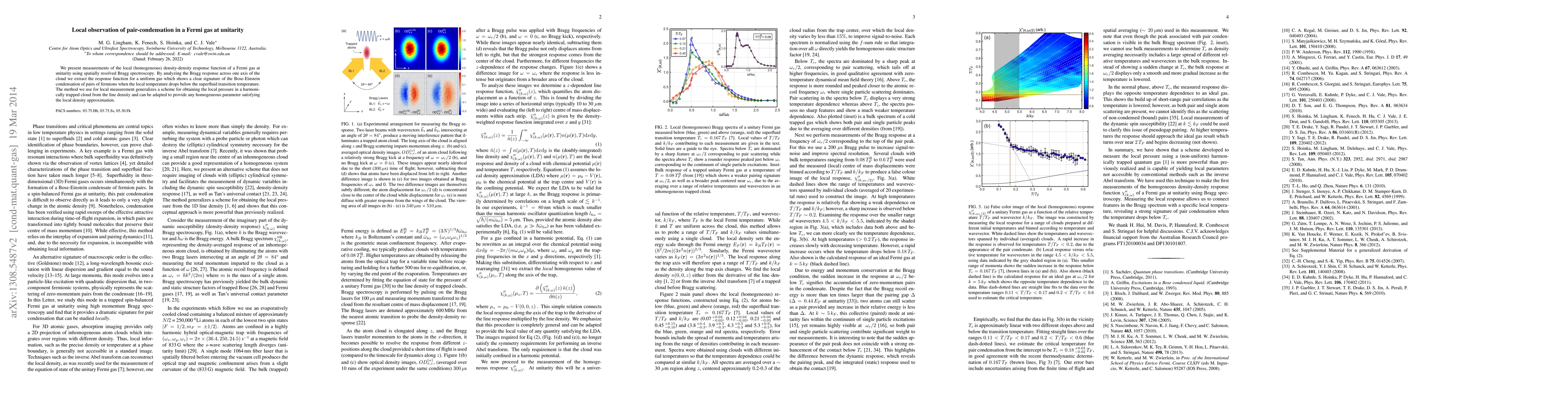 We present measurements of the local (homogeneous) density-density response function of a Fermi gas at unitarity using spatially resolved Bragg spectroscopy. By analyzing the Bragg response across one axis of the cloud we extract the response function for a uniform gas which shows a clear signature of the Bose-Einstein condensation of pairs of fermions when the local temperature drops below the superfluid transition temperature. The method we use for local measurement generalizes a scheme for obtaining the local pressure in a harmonically trapped cloud from the line density and can be adapted to provide any homogeneous parameter satisfying the local density approximation.