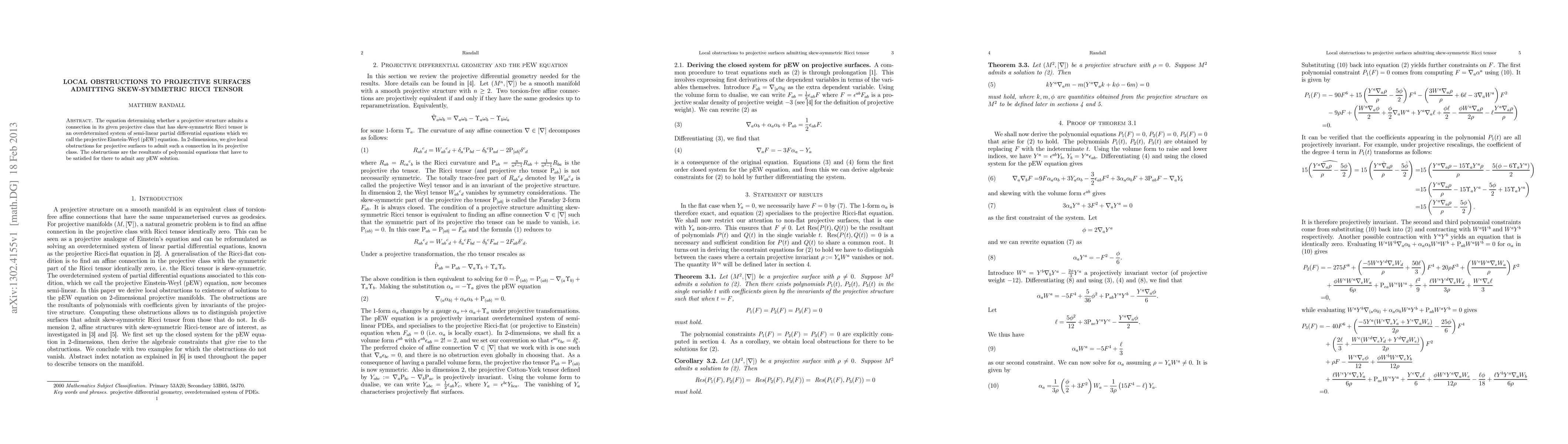 The equation determining whether a projective structure admits a connection in its given projective class that has skew-symmetric Ricci tensor is an overdetermined system of semi-linear partial differential equations which we call the projective Einstein-Weyl (pEW) equation. In 2-dimensions, we give local obstructions for projective surfaces to admit such a connection in its projective class. The obstructions are the resultants of polynomial equations that have to be satisfied for there to admit any pEW solution.