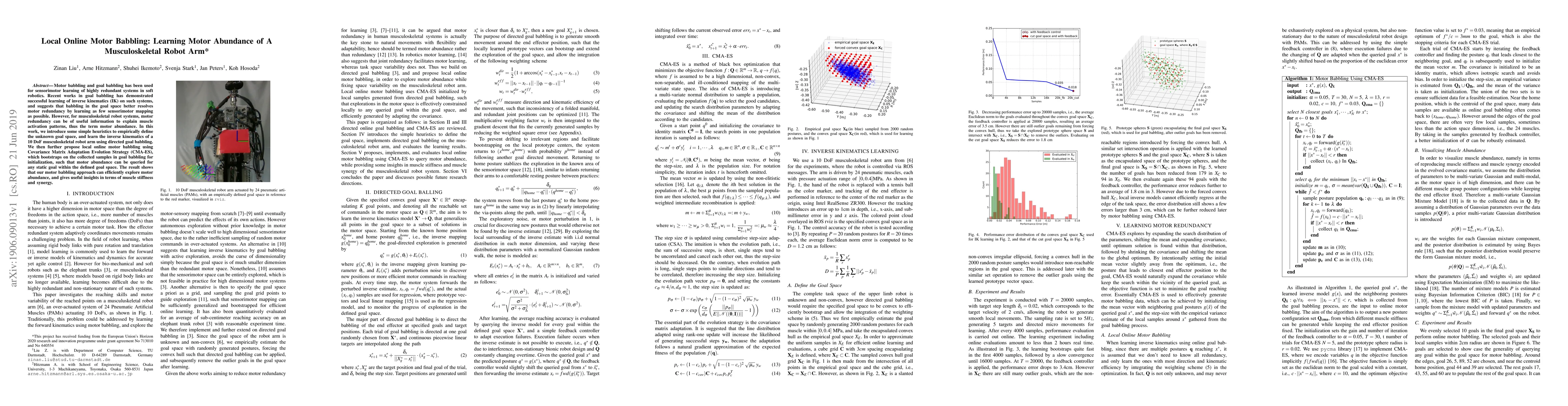This paper introduces heuristics for defining an unknown goal space and uses directed goal babbling to learn inverse kinematics for a 10 DoF musculoskeletal robot arm. It further proposes local online motor babbling with CMA-ES to explore motor abundance, demonstrating efficient exploration and insights into muscle stiffness and synergy.