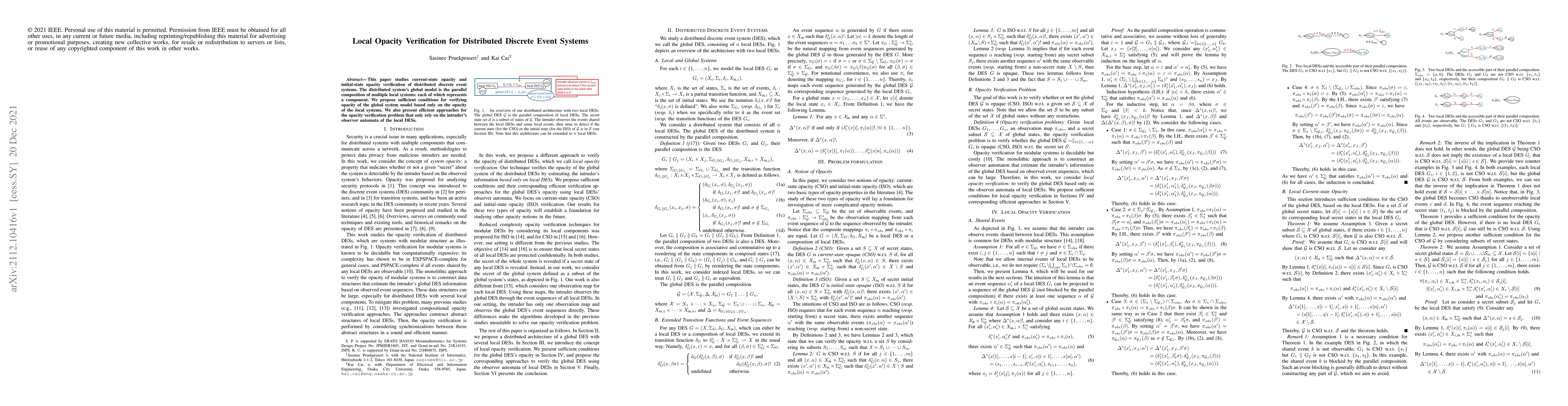 This paper proposes sufficient conditions for verifying opacity in distributed discrete event systems based on local system opacity, and presents efficient verification methods relying solely on local observer automata. The focus is on both current-state and initial-state opacity verification.