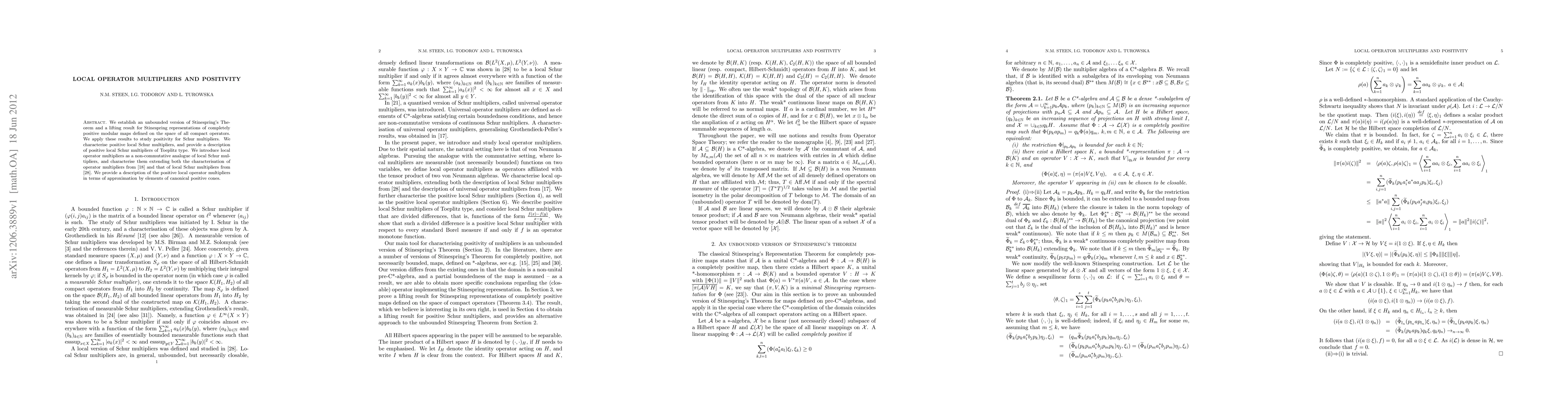 This paper establishes an unbounded version of Stinespring's Theorem for completely positive modular maps on compact operators and characterizes positive local Schur multipliers, including Toeplitz type multipliers. It introduces local operator multipliers as a non-commutative analogue and describes positive local operator multipliers through approximation by canonical positive cones.