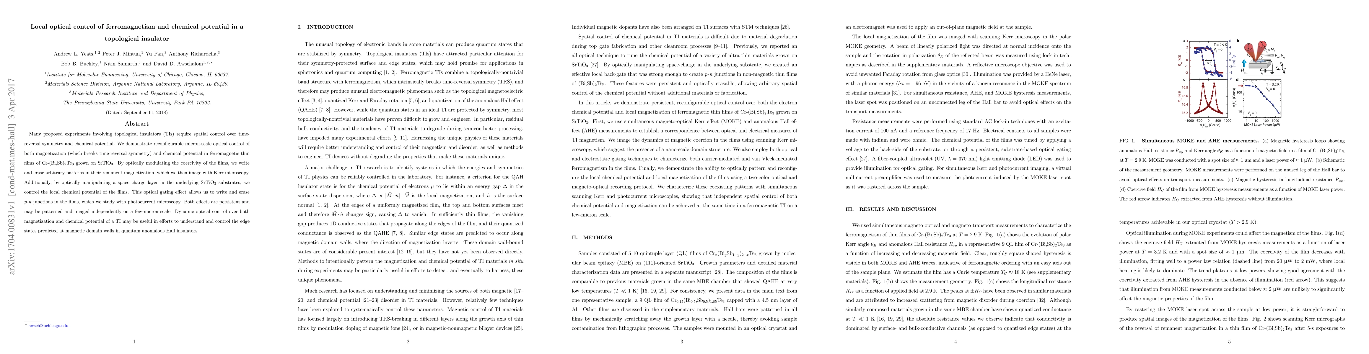 Many proposed experiments involving topological insulators (TIs) require spatial control over time-reversal symmetry and chemical potential. We demonstrate reconfigurable micron-scale optical control of both magnetization (which breaks time-reversal symmetry) and chemical potential in ferromagnetic thin films of Cr-(Bi,Sb)$_2$Te$_3$ grown on SrTiO$_3$. By optically modulating the coercivity of the films, we write and erase arbitrary patterns in their remanent magnetization, which we then image with Kerr microscopy. Additionally, by optically manipulating a space charge layer in the underlying SrTiO$_3$ substrates, we control the local chemical potential of the films. This optical gating effect allows us to write and erase p-n junctions in the films, which we study with photocurrent microscopy. Both effects are persistent and may be patterned and imaged independently on a few-micron scale. Dynamic optical control over both magnetization and chemical potential of a TI may be useful in efforts to understand and control the edge states predicted at magnetic domain walls in quantum anomalous Hall insulators.