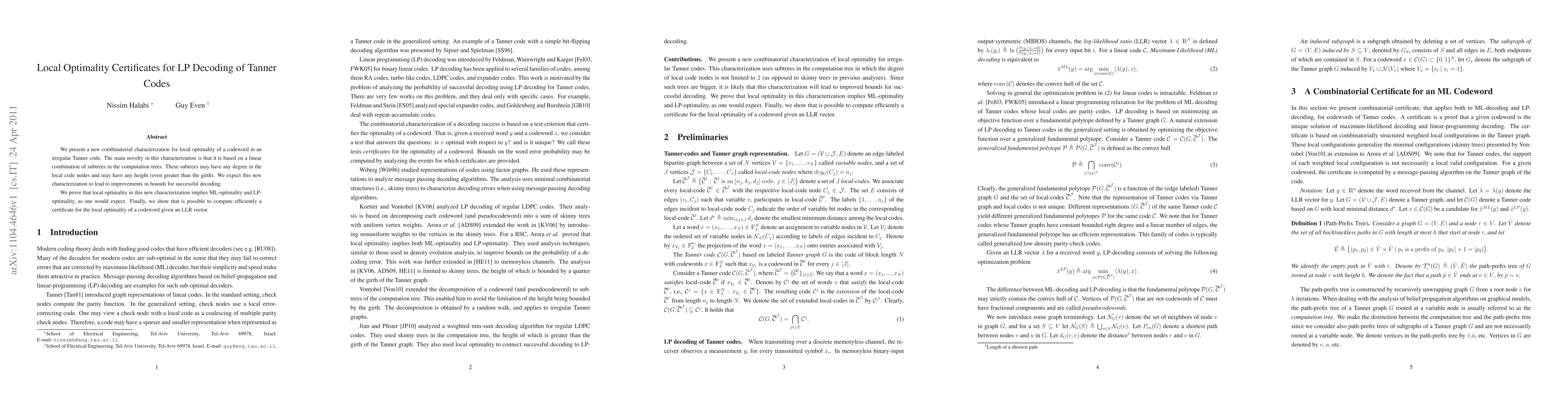 This paper introduces a novel combinatorial framework for assessing local optimality in decoding irregular Tanner codes, based on linear combinations of subtrees in computation trees. The proposed characterization is expected to enhance decoding performance and efficiency, as it implies both maximum likelihood and linear programming optimality.