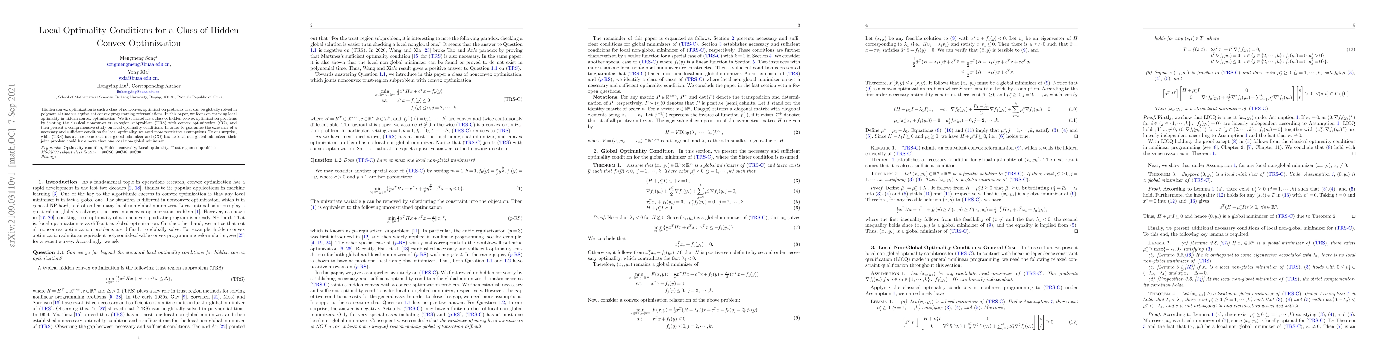 This paper investigates local optimality conditions for hidden convex optimization, which combines nonconvex trust-region subproblems with convex optimization. It finds that while individual components have limited local non-global minimizers, their joint formulation can have multiple local non-global minimizers, necessitating stricter assumptions for necessary and sufficient local optimality conditions.