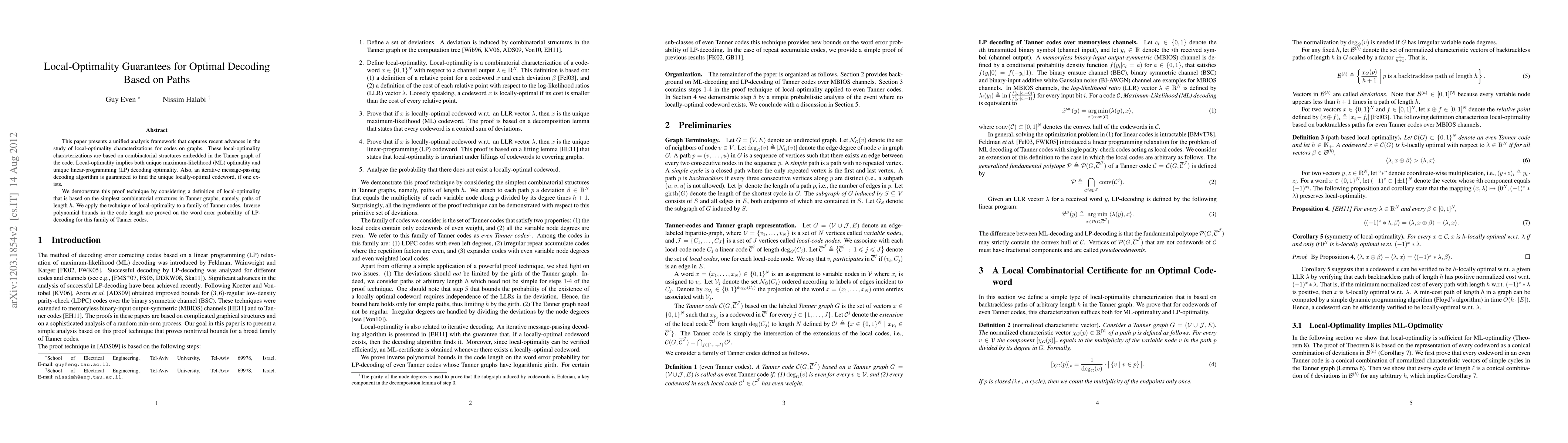 This paper presents a unified analysis framework that captures recent advances in the study of local-optimality characterizations for codes on graphs. These local-optimality characterizations are based on combinatorial structures embedded in the Tanner graph of the code. Local-optimality implies both unique maximum-likelihood (ML) optimality and unique linear-programming (LP) decoding optimality. Also, an iterative message-passing decoding algorithm is guaranteed to find the unique locally-optimal codeword, if one exists. We demonstrate this proof technique by considering a definition of local-optimality that is based on the simplest combinatorial structures in Tanner graphs, namely, paths of length $h$. We apply the technique of local-optimality to a family of Tanner codes. Inverse polynomial bounds in the code length are proved on the word error probability of LP-decoding for this family of Tanner codes.