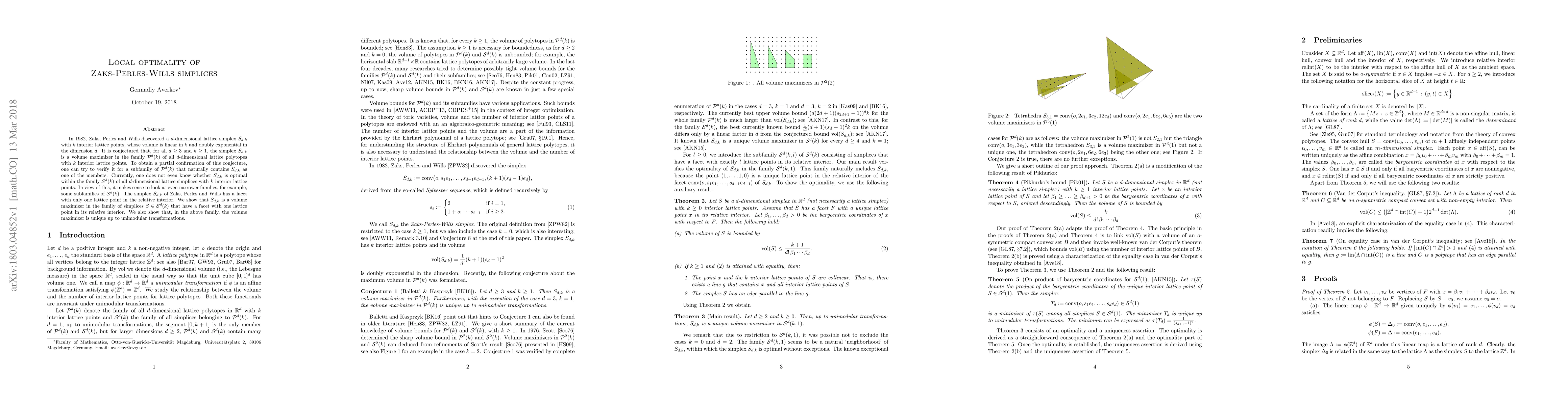 The paper proves that the Zaks-Perles-Wills simplices are volume maximizers in a specific subfamily of d-dimensional lattice simplices with k interior lattice points, characterized by having a facet with only one lattice point in its relative interior. It also demonstrates the uniqueness of this maximizer up to unimodular transformations.