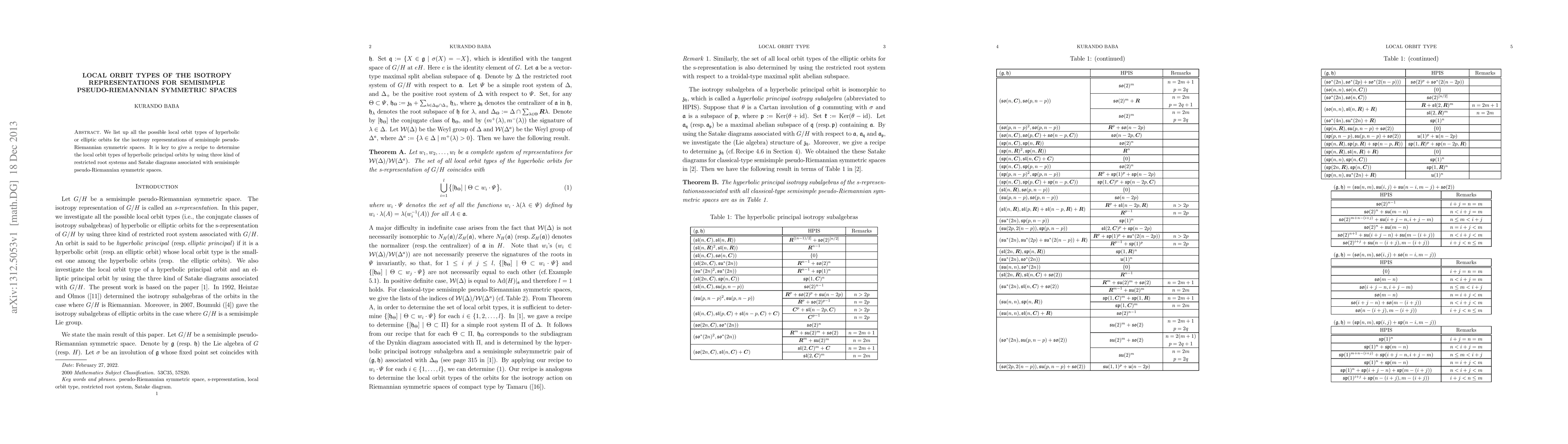 This paper catalogs the local orbit types for isotropy representations in semisimple pseudo-Riemannian symmetric spaces, utilizing restricted root systems and Satake diagrams to determine hyperbolic principal orbits. It provides a method to identify these orbit types through specific classification techniques.