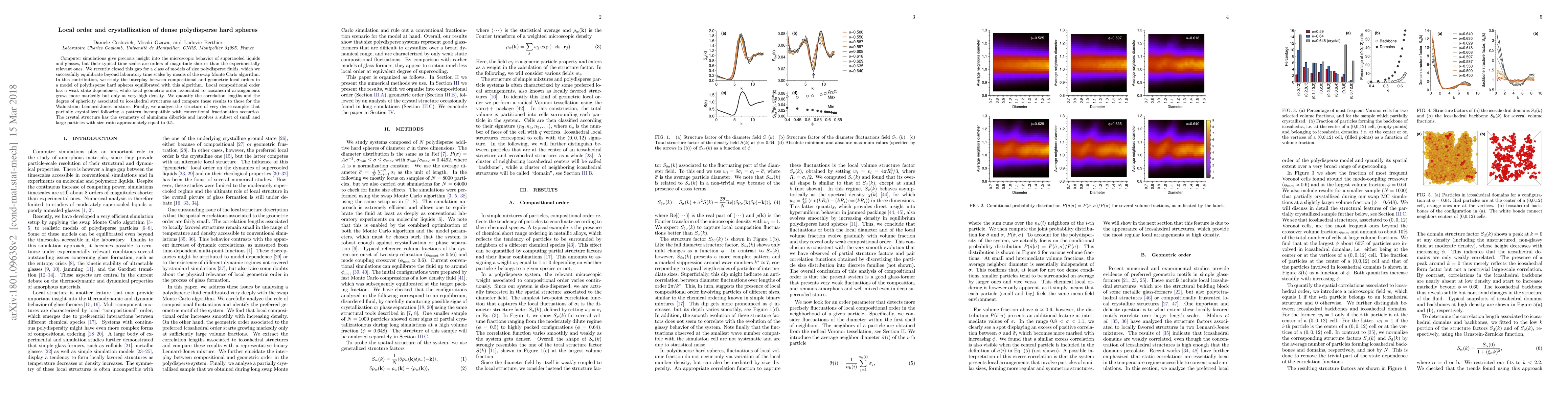 Computer simulations give precious insight into the microscopic behavior of supercooled liquids and glasses, but their typical time scales are orders of magnitude shorter than the experimentally relevant ones. We recently closed this gap for a class of models of size polydisperse fluids, which we successfully equilibrate beyond laboratory time scales by means of the swap Monte Carlo algorithm. In this contribution, we study the interplay between compositional and geometric local orders in a model of polydisperse hard spheres equilibrated with this algorithm. Local compositional order has a weak state dependence, while local geometric order associated to icosahedral arrangements grows more markedly but only at very high density. We quantify the correlation lengths and the degree of sphericity associated to icosahedral structures and compare these results to those for the Wahnstr\"om Lennard-Jones mixture. Finally, we analyze the structure of very dense samples that partially crystallized following a pattern incompatible with conventional fractionation scenarios. The crystal structure has the symmetry of aluminum diboride and involves a subset of small and large particles with size ratio approximately equal to 0.5.