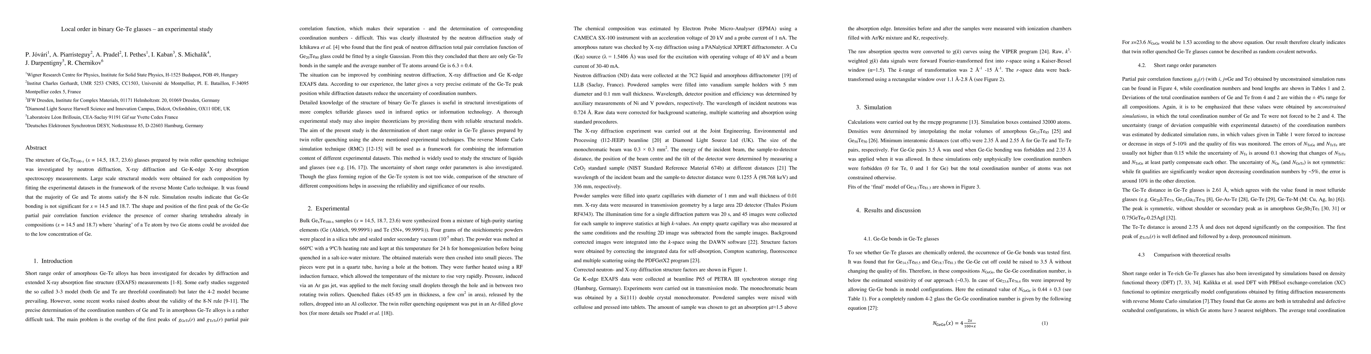 The structure of $\mathrm{Ge}_x\mathrm{Te}_{100-x}$ (x = 14.5, 18.7, 23.6) glasses prepared by twin roller quenching technique was investigated by neutron diffraction, X-ray diffraction and Ge-K-edge X-ray absorption spectroscopy measurements. Large scale structural models were obtained for each composition by fitting the experimental datasets in the framework of the reverse Monte Carlo technique. It was found that the majority of Ge and Te atoms satisfy the 8-N rule. Simulation results indicate that Ge-Ge bonding is not significant for x = 14.5 and 18.7. The shape and position of the first peak of the Ge-Ge partial pair correlation function evidence the presence of corner sharing tetrahedra already in compositions (x = 14.5 and 18.7) where 'sharing' of a Te atom by two Ge atoms could be avoided due to the low concentration of Ge.