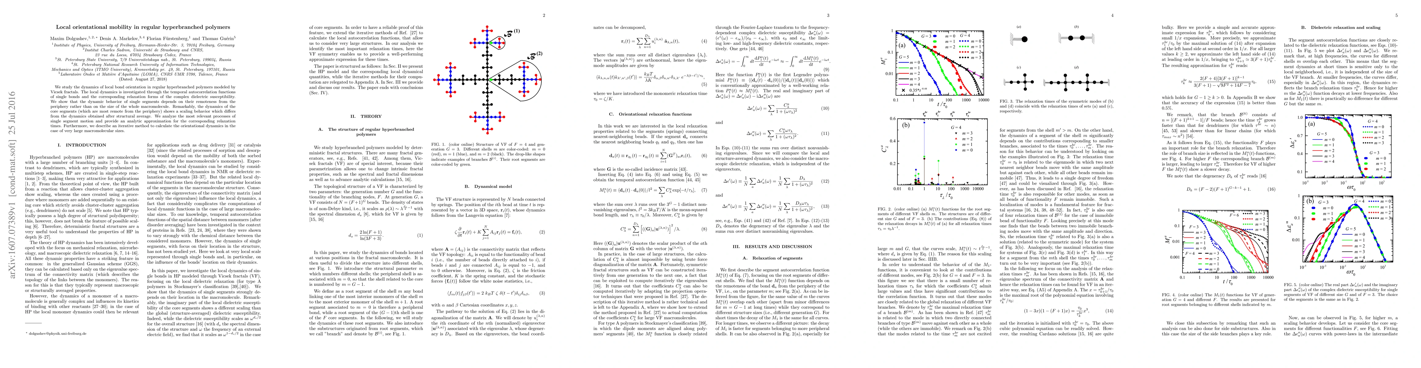 We study the dynamics of local bond orientation in regular hyperbranched polymers modeled by Vicsek fractals. The local dynamics is investigated through the temporal autocorrelation functions of single bonds and the corresponding relaxation forms of the complex dielectric susceptibility. We show that the dynamic behavior of single segments depends on their remoteness from the periphery rather than on the size of the whole macromolecule. Remarkably, the dynamics of the core segments (which are most remote from the periphery) shows a scaling behavior that differs from the dynamics obtained after structural average. We analyze the most relevant processes of single segment motion and provide an analytic approximation for the corresponding relaxation times. Furthermore, we describe an iterative method to calculate the orientational dynamics in the case of very large macromolecular sizes.