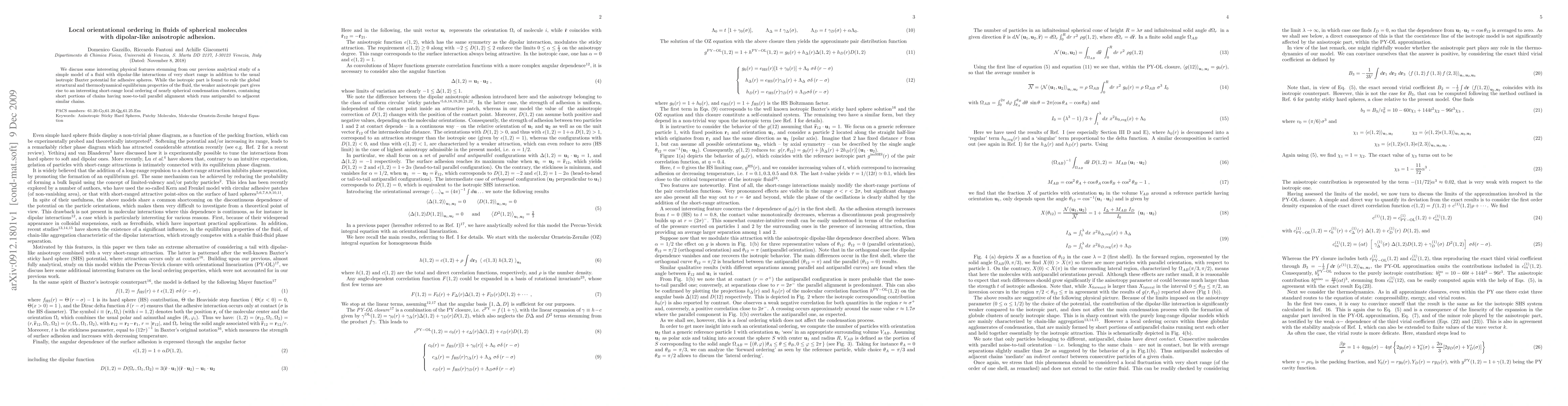 We discuss some interesting physical features stemming from our previous analytical study of a simple model of a fluid with dipolar-like interactions of very short range in addition to the usual isotropic Baxter potential for adhesive spheres. While the isotropic part is found to rule the global structural and thermodynamical equilibrium properties of the fluid, the weaker anisotropic part gives rise to an interesting short-range local ordering of nearly spherical condensation clusters, containing short portions of chains having nose-to-tail parallel alignment which runs antiparallel to adjacent similar chains.