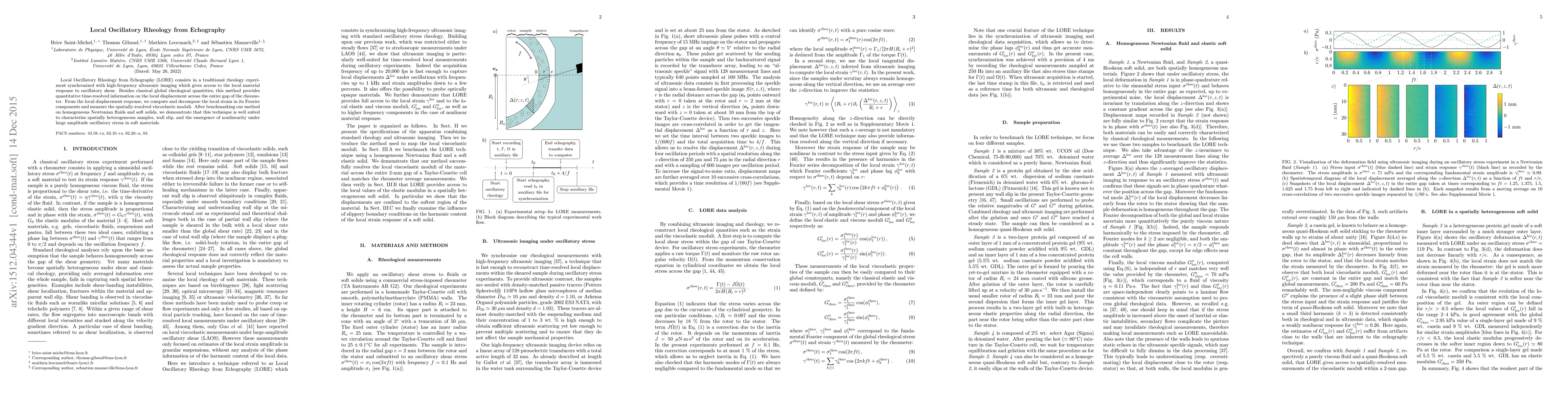 Local Oscillatory Rheology from Echography (LORE) consists in a traditional rheology experiment synchronized with high-frequency ultrasonic imaging which gives access to the local material response to oscillatory shear. Besides classical global rheological quantities, this method provides quantitative time-resolved information on the local displacement across the entire gap of the rheometer. From the local displacement response, we compute and decompose the local strain in its Fourier components and measure the spatially-resolved viscoelastic moduli. After benchmarking our method on homogeneous Newtonian fluids and soft solids, we demonstrate that this technique is well suited to characterize spatially heterogeneous samples, wall slip, and the emergence of nonlinearity under large amplitude oscillatory stress in soft materials.