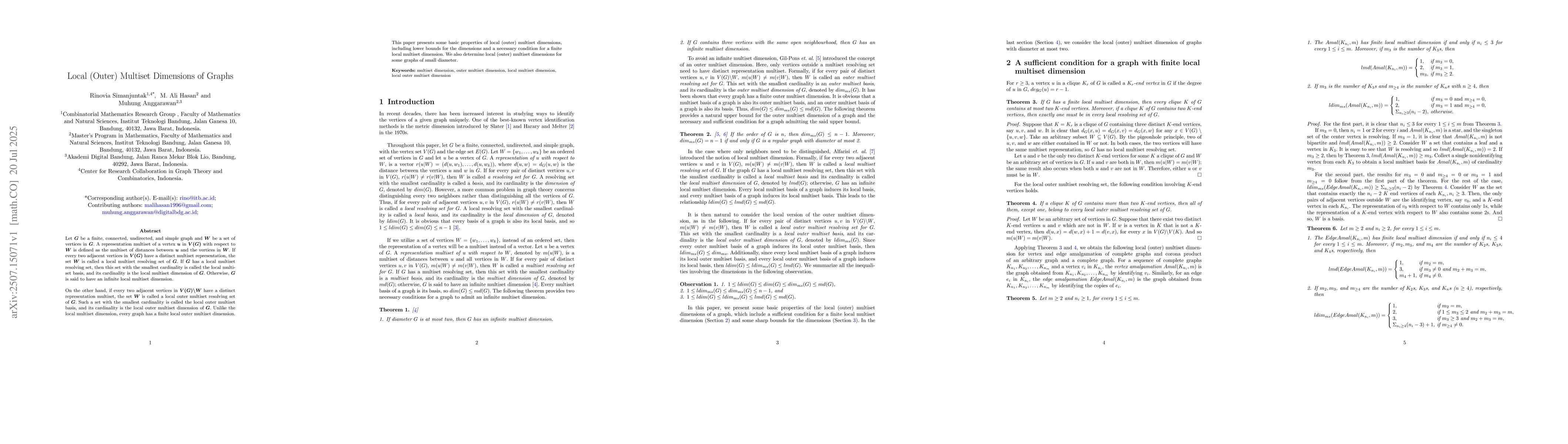 Let $G$ be a finite, connected, undirected, and simple graph and $W$ be a set of vertices in $G$. A representation multiset of a vertex $u$ in $V(G)$ with respect to $W$ is defined as the multiset of distances between $u$ and the vertices in $W$. If every two adjacent vertices in $V(G)$ have a distinct multiset representation, the set $W$ is called a local multiset resolving set of $G$. If $G$ has a local multiset resolving set, then this set with the smallest cardinality is called the local multiset basis, and its cardinality is the local multiset dimension of $G$. Otherwise, $G$ is said to have an infinite local multiset dimension. On the other hand, if every two adjacent vertices in $V(G) \backslash W$ have a distinct representation multiset, the set $W$ is called a local outer multiset resolving set of $G$. Such a set with the smallest cardinality is called the local outer multiset basis, and its cardinality is the local outer multiset dimension of $G$. Unlike the local multiset dimension, every graph has a finite local outer multiset dimension. This paper presents some basic properties of local (outer) multiset dimensions, including lower bounds for the dimensions and a necessary condition for a finite local multiset dimension. We also determine local (outer) multiset dimensions for some graphs of small diameter.
