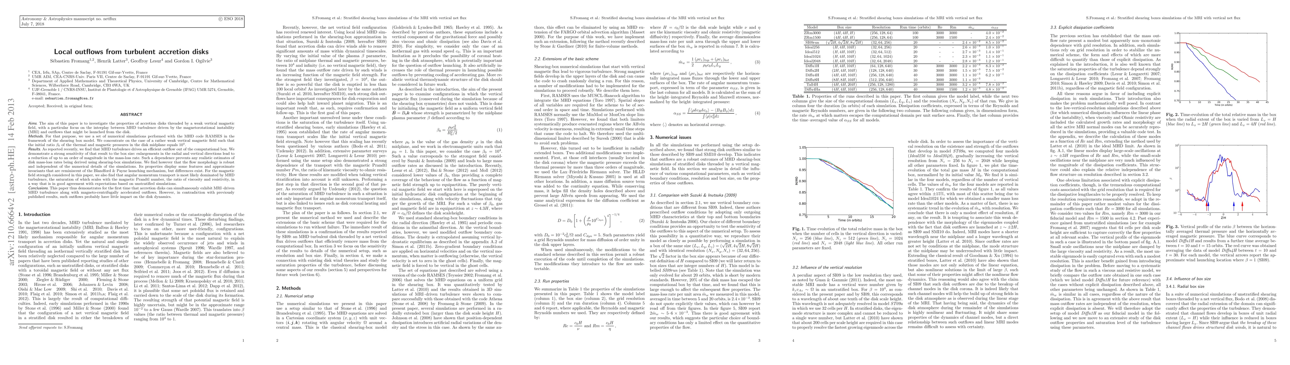 The aim of this paper is to investigate the properties of accretion disks threaded by a weak vertical magnetic field, with a particular focus on the interplay between MHD turbulence driven by the magnetorotational instability (MRI) and outflows that might be launched from the disk. For that purpose, we use a set of numerical simulations performed with the MHD code RAMSES in the framework of the shearing box model. We concentrate on the case of a rather weak vertical magnetic field such that the initial ratio beta0 of the thermal and magnetic pressures in the disk midplane equals 10^4. As reported recently, we find that MHD turbulence drives an efficient outflow out of the computational box. We demonstrate a strong sensitivity of that result to the box size: enlargements in the radial and vertical directions lead to a reduction of up to an order of magnitude in the mass-loss rate. Such a dependence prevents any realistic estimates of disk mass-loss rates being derived using shearing-box simulations. We find however that the flow morphology is robust and independent of the numerical details of the simulations. Its properties display some features and approximate invariants that are reminiscent of the Blandford & Payne launching mechanism, but differences exist. For the magnetic field strength considered in this paper, we also find that angular momentum transport is most likely dominated by MHD turbulence, the saturation of which scales with the magnetic Prandtl number, the ratio of viscosity and resistivity, in a way that is in good agreement with expectations based on unstratified simulations. This paper thus demonstrates for the first time that accretion disks can simultaneously exhibit MRI-driven MHD turbulence along with magneto-centrifugally accelerated outflows.