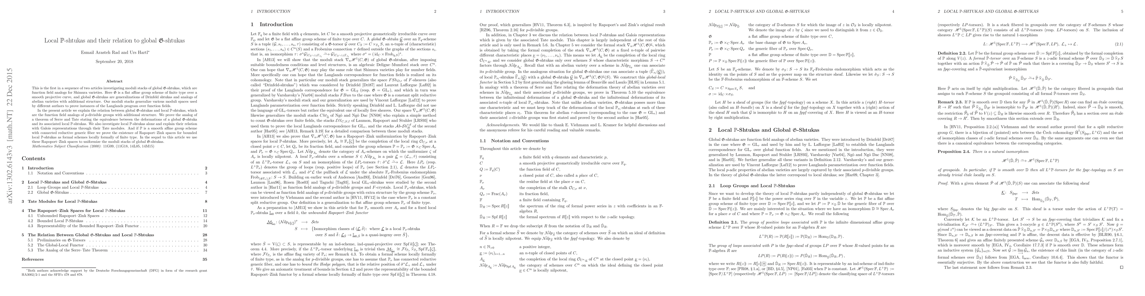 This paper explores the connection between global G-shtukas and local P-shtukas in function field analogs, proving their equivalence via deformation theory. It also establishes the existence of Rapoport-Zink spaces for bounded local P-shtukas and investigates their relation to Galois representations through Tate modules.