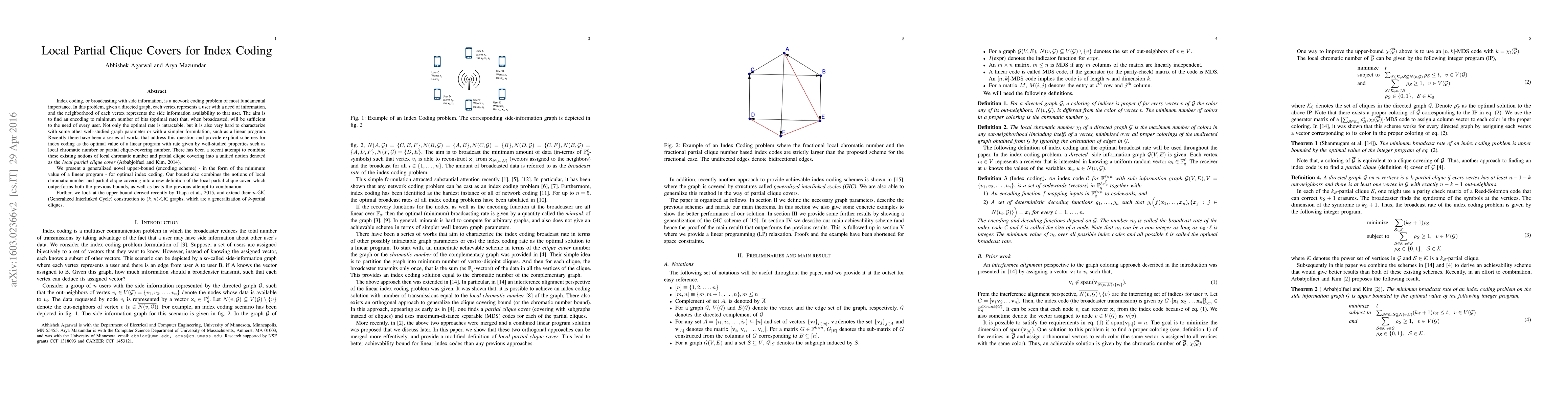 Index coding, or broadcasting with side information, is a network coding problem of most fundamental importance. In this problem, given a directed graph, each vertex represents a user with a need of information, and the neighborhood of each vertex represents the side information availability to that user. The aim is to find an encoding to minimum number of bits (optimal rate) that, when broadcasted, will be sufficient to the need of every user. Not only the optimal rate is intractable, but it is also very hard to characterize with some other well-studied graph parameter or with a simpler formulation, such as a linear program. Recently there have been a series of works that address this question and provide explicit schemes for index coding as the optimal value of a linear program with rate given by well-studied properties such as local chromatic number or partial clique-covering number. There has been a recent attempt to combine these existing notions of local chromatic number and partial clique covering into a unified notion denoted as the local partial clique cover (Arbabjolfaei and Kim, 2014). We present a generalized novel upper-bound (encoding scheme) - in the form of the minimum value of a linear program - for optimal index coding. Our bound also combines the notions of local chromatic number and partial clique covering into a new definition of the local partial clique cover, which outperforms both the previous bounds, as well as beats the previous attempt to combination. Further, we look at the upper bound derived recently by Thapa et al., 2015, and extend their $n$-$\mathsf{GIC}$ (Generalized Interlinked Cycle) construction to $(k,n)$-$\mathsf{GIC}$ graphs, which are a generalization of $k$-partial cliques.