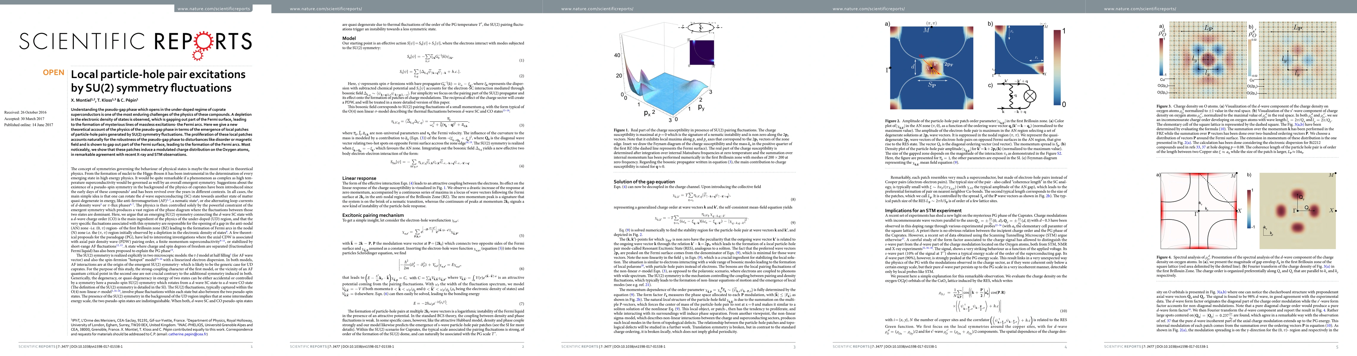 Understanding the pseudo-gap phase which opens in the under-doped regime of cuprate superconductors is one of the most enduring challenges of the physics of these compounds. A depletion in the electronic density of states is observed, which is gapping out part of the Fermi surface, leading to the formation of mysterious lines of massless excitations- the Fermi arcs. Here we give a new theoretical account of the physics of the pseudo-gap phase in terms of the emergence of local patches of particle-hole pairs generated by SU(2) symmetry fluctuations. The proliferation of these local patches accounts naturally for the robustness of the pseudo-gap phase to disturbances like disorder or magnetic field and is shown to gap out part fo the Fermi surface, leading to the formation of the Fermi arcs. Most noticeably, we show that these patches induce a modulated charge distribution on the Oxygen atoms, in remarkable agreement with recent X-ray and STM observations.
