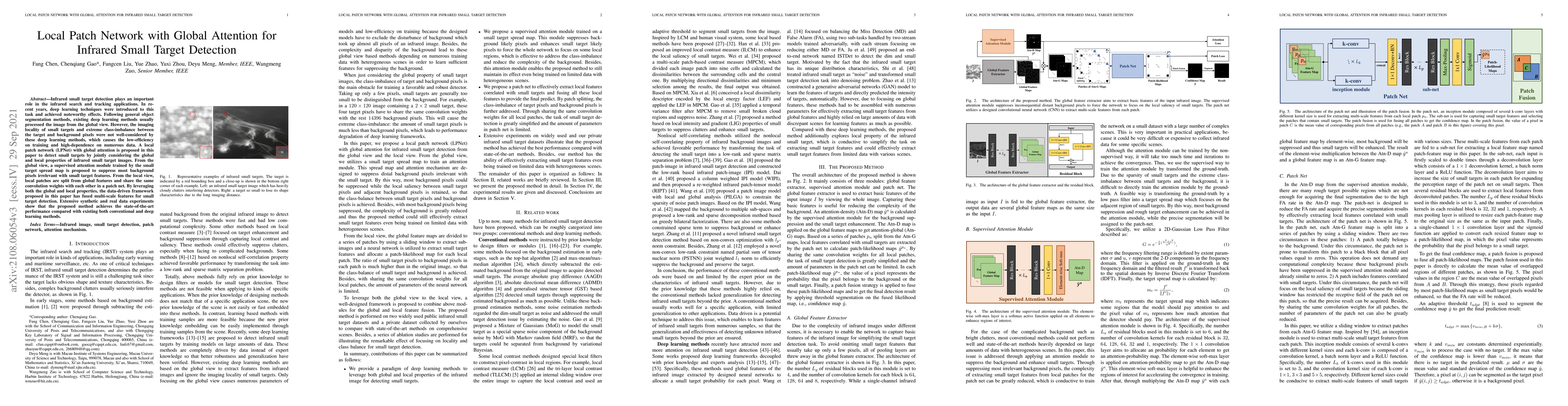This paper proposes a local patch network with global attention to enhance infrared small target detection, addressing the challenges of imaging locality and class imbalance. The method combines global and local features to achieve state-of-the-art performance in detecting small targets, outperforming existing conventional and deep learning methods.