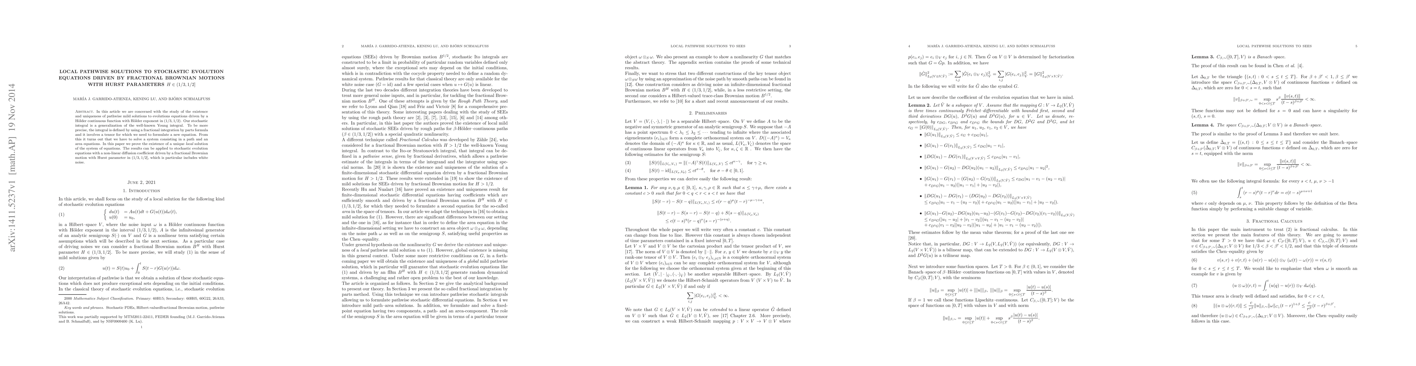 In this article we are concerned with the study of the existence and uniqueness of pathwise mild solutions to evolutions equations driven by a H\"older continuous function with H\"older exponent in $(1/3,1/2)$. Our stochastic integral is a generalization of the well-known Young integral. To be more precise, the integral is defined by using a fractional integration by parts formula and it involves a tensor for which we need to formulate a new equation. From this it turns out that we have to solve a system consisting in a path and an area equations. In this paper we prove the existence of a unique local solution of the system of equations. The results can be applied to stochastic evolution equations with a non-linear diffusion coefficient driven by a fractional Brownian motion with Hurst parameter in $(1/3,1/2]$, which is particular includes white noise.