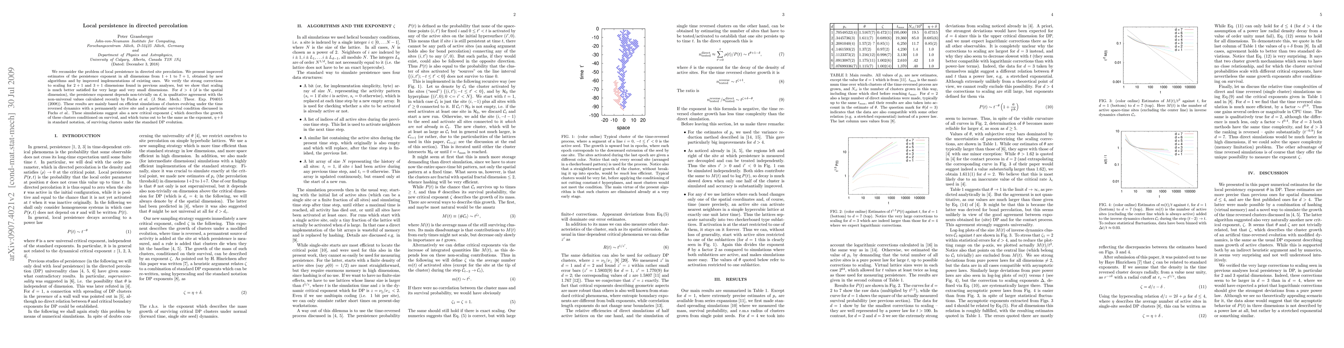 We reconsider the problem of local persistence in directed site percolation. We present improved estimates of the persistence exponent in all dimensions from 1+1 to 7+1, obtained by new algorithms and by improved implementations of existing ones. We verify the strong corrections to scaling for 2+1 and 3+1 dimensions found in previous analyses, but we show that scaling is much better satisfied for very large and very small dimensions. For d > 4 (d is the spatial dimension), the persistence exponent depends non-trivially on d, in qualitative agreement with the non-universal values calculated recently by Fuchs {\it et al.} (J. Stat. Mech.: Theor. Exp. P04015 (2008)). These results are mainly based on efficient simulations of clusters evolving under the time reversed dynamics with a permanently active site and a particular survival condition discussed in Fuchs {\it et al.}. These simulations suggest also a new critical exponent $\zeta$ which describes the growth of these clusters conditioned on survival, and which turns out to be the same as the exponent, \eta+\delta in standard notation, of surviving clusters under the standard DP evolution.
