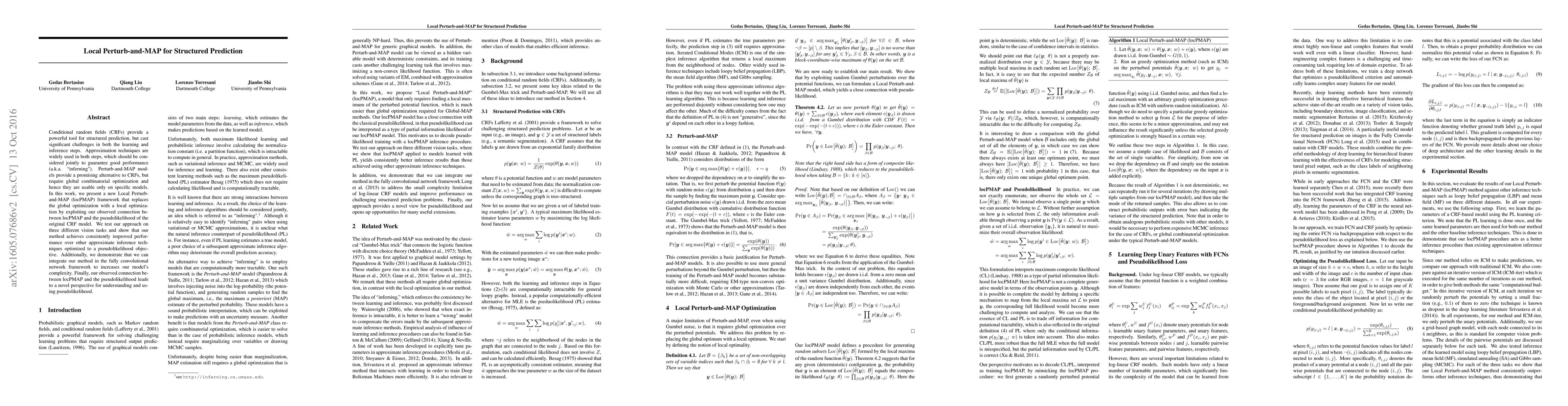 Conditional random fields (CRFs) provide a powerful tool for structured prediction, but cast significant challenges in both the learning and inference steps. Approximation techniques are widely used in both steps, which should be considered jointly to guarantee good performance (a.k.a. "inferning"). Perturb-and-MAP models provide a promising alternative to CRFs, but require global combinatorial optimization and hence they are usable only on specific models. In this work, we present a new Local Perturb-and-MAP (locPMAP) framework that replaces the global optimization with a local optimization by exploiting our observed connection between locPMAP and the pseudolikelihood of the original CRF model. We test our approach on three different vision tasks and show that our method achieves consistently improved performance over other approximate inference techniques optimized to a pseudolikelihood objective. Additionally, we demonstrate that we can integrate our method in the fully convolutional network framework to increase our model's complexity. Finally, our observed connection between locPMAP and the pseudolikelihood leads to a novel perspective for understanding and using pseudolikelihood.