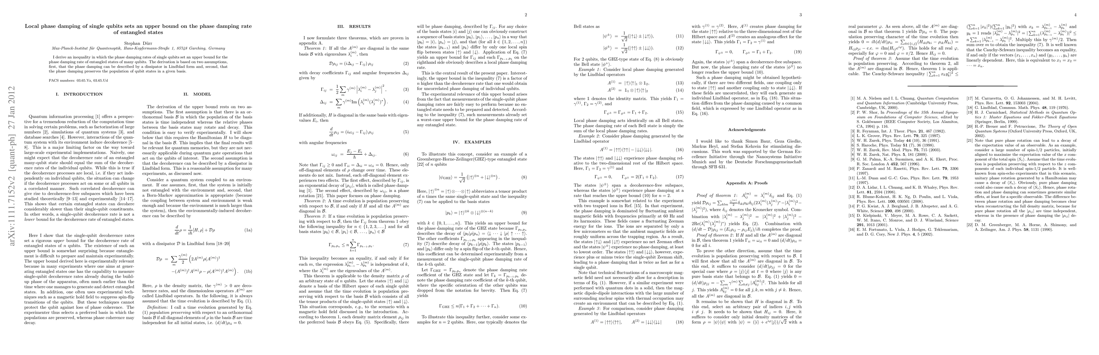I derive an inequality in which the phase damping rates of single qubits set an upper bound for the phase damping rate of entangled states of many qubits. The derivation is based on two assumptions: first, that the phase damping can be described by a dissipator in Lindblad form and, second, that the phase damping preserves the population of qubit states in a given basis.