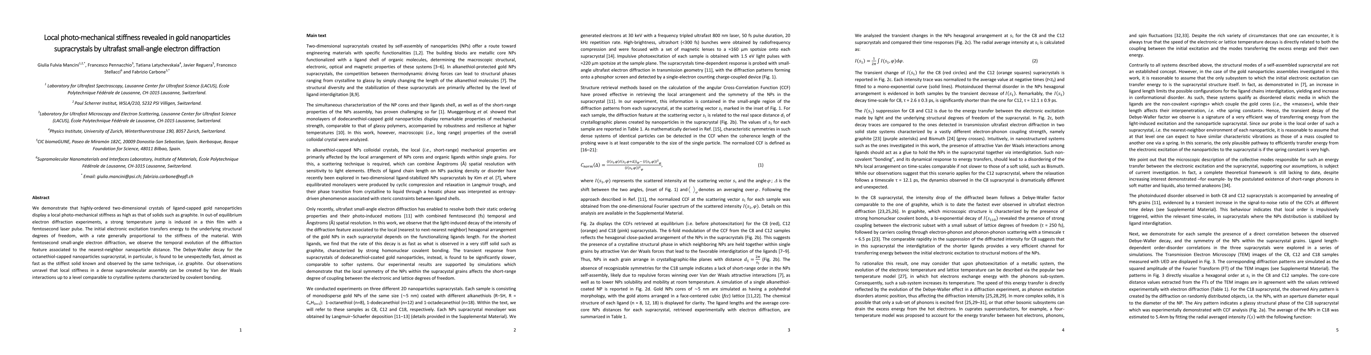 The paper reveals that gold nanoparticle supracrystals exhibit surprising local stiffness, comparable to that of graphite, via ultrafast electron diffraction after femtosecond laser-induced temperature jumps. This stiffness is attributed to Van der Waals interactions within the dense nanoparticle assembly.