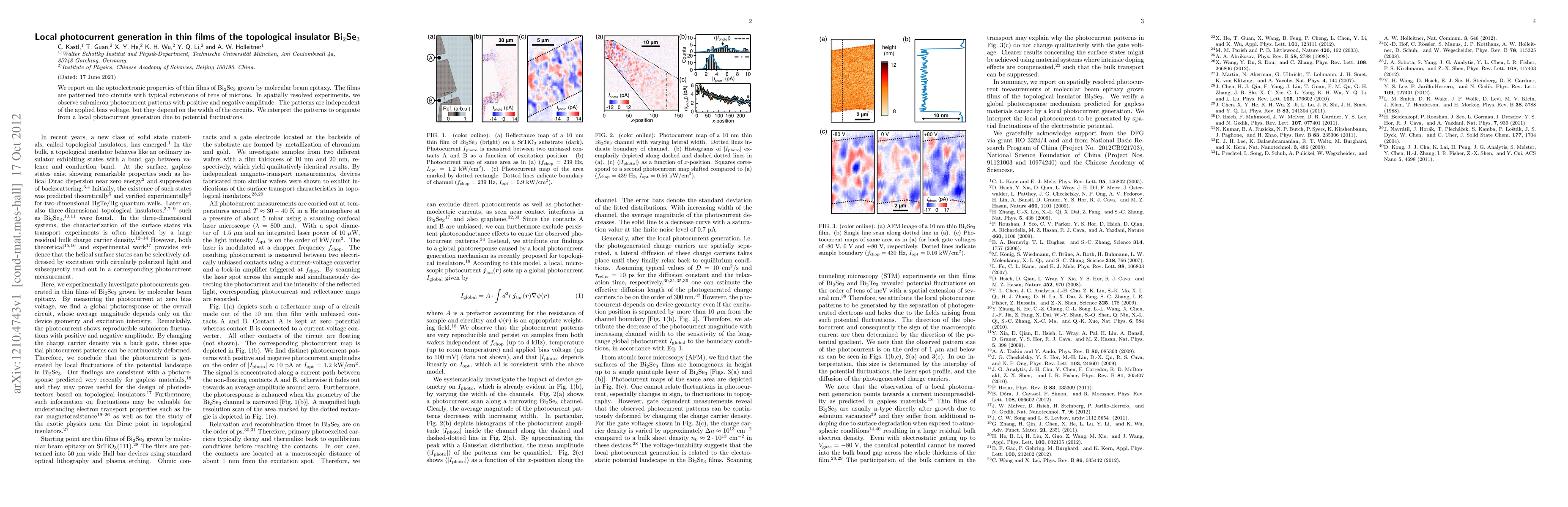 We report on the optoelectronic properties of thin films of Bi2Se3 grown by molecular beam epitaxy. The films are patterned into circuits with typical extensions of tens of microns. In spatially resolved experiments, we observe submicron photocurrent patterns with positive and negative amplitude. The patterns are independent of the applied bias voltage, but they depend on the width of the circuits. We interpret the patterns to originate from a local photocurrent generation due to potential fluctuations.