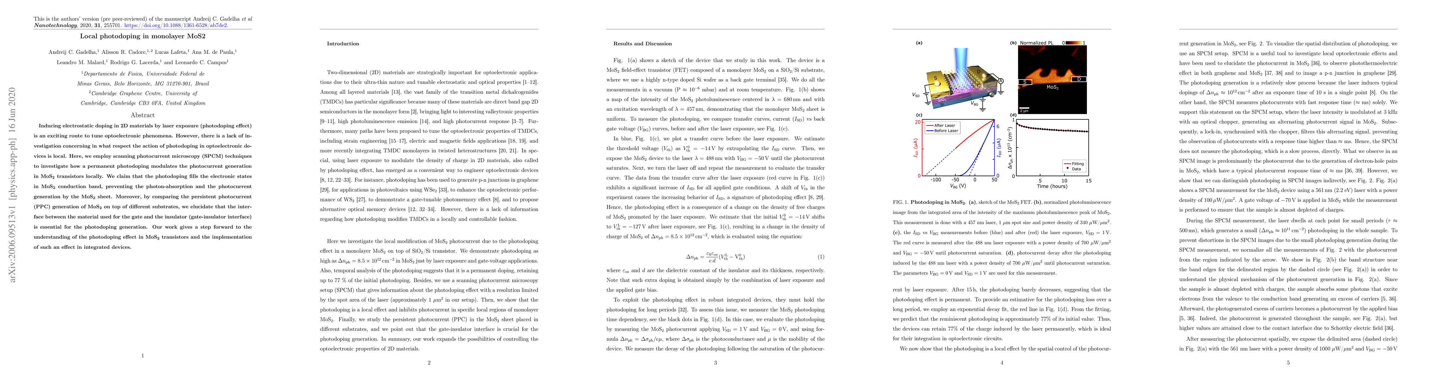 Inducing electrostatic doping in 2D materials by laser exposure (photodoping effect) is an exciting route to tune optoelectronic phenomena. However, there is a lack of investigation concerning in what respect the action of photodoping in optoelectronic devices is local. Here, we employ scanning photocurrent microscopy (SPCM) techniques to investigate how a permanent photodoping modulates the photocurrent generation in MoS2 transistors locally. We claim that the photodoping fills the electronic states in MoS2 conduction band, preventing the photon-absorption and the photocurrent generation by the MoS2 sheet. Moreover, by comparing the persistent photocurrent (PPC) generation of MoS2 on top of different substrates, we elucidate that the interface between the material used for the gate and the insulator (gate-insulator interface) is essential for the photodoping generation. Our work gives a step forward to the understanding of the photodoping effect in MoS2 transistors and the implementation of such an effect in integrated devices.