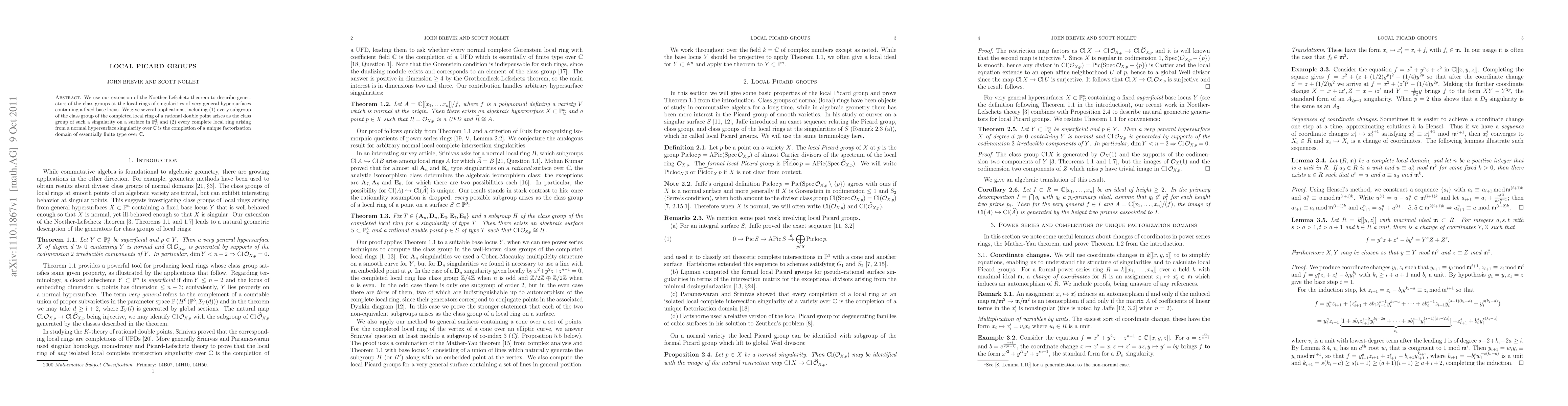 We use our extension of the Noether-Lefschetz theorem to describe generators of the class groups at the local rings of singularities of very general hypersurfaces containing a fixed base locus. We give several applications, including (1) every subgroup of the class group of the completed local ring of a rational double point arises as the class group of such a singularity on a surface in complex projective 3-space and (2) every complete local ring arising from a normal hypersurface singularity over the complex numbers is the completion of a unique factorization domain of essentially finite type over the complex numbers.
