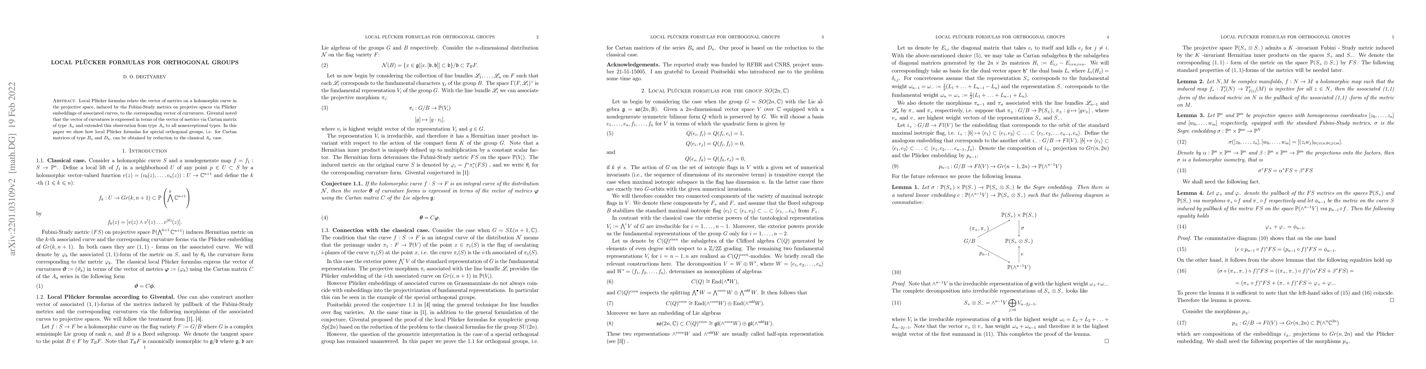 Local Pl\"ucker formulas relate the vector of metrics on a holomorphic curve in the projective space, induced by the Fubini-Study metrics on projetive spaces via Pl\"ucker embeddings of associated curves, to the corresponding vector of curvatures. Givental noted that the vector of curvatures is expressed in terms of the vector of metrics via Cartan matrix of type $ A_n$ and extended this observation from type $A_n$ to all nonexceptional types. In this paper we show how local Pl\"ucker formulas for special orthogonal groups, i.e. for Cartan matrices of type $ B_n$ and $ D_n$, can be obtained by reduction to the classical $A_n$ case.