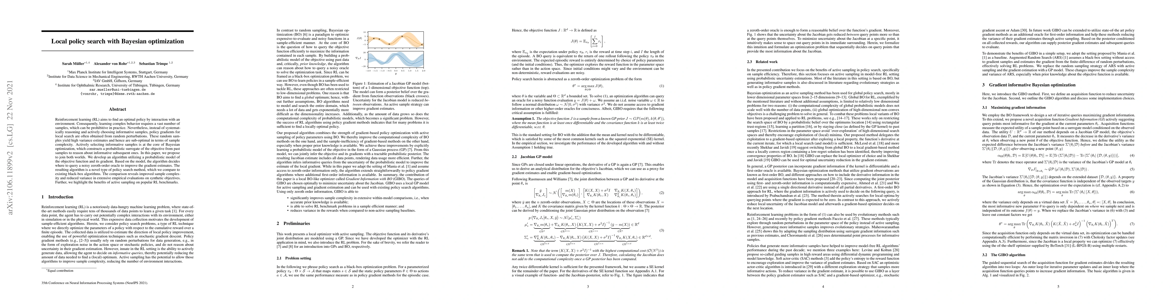 This paper proposes a novel policy search algorithm that combines reinforcement learning with Bayesian optimization to improve sample efficiency and reduce variance. The algorithm actively selects informative samples based on a probabilistic model, achieving better performance compared to random sampling methods on both synthetic and reinforcement learning benchmarks.