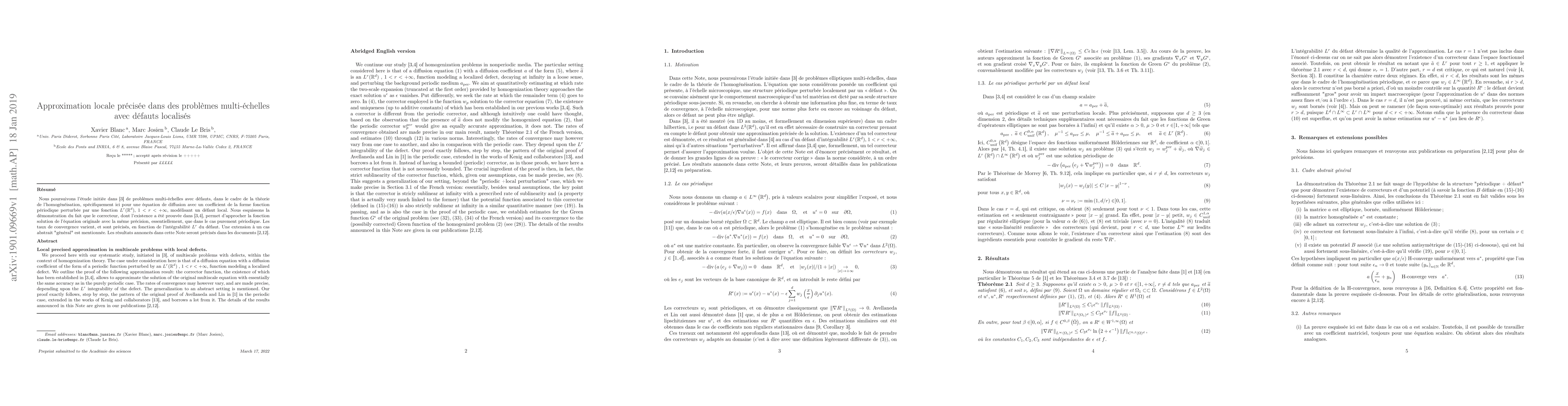 We proceed here with our systematic study, initiated in [3], of multiscale problems with defects, within the context of homogenization theory. The case under consideration here is that of a diffusion equation with a diffusion coefficient of the form of a periodic function perturbed by an $L^r (R^d ) , 1 < r < +$\infty$$ , function modeling a localized defect. We outline the proof of the following approximation result: the corrector function, the existence of which has been established in [3,4], allows to approximate the solution of the original multiscale equation with essentially the same accuracy as in the purely periodic case. The rates of convergence may however vary, and are made precise, depending upon the $L^r$ integrability of the defect. The generalization to an abstract setting is mentioned. Our proof exactly follows, step by step, the pattern of the original proof of Avellaneda and Lin in [1] in the periodic case, extended in the works of Kenig and collaborators [13], and borrows a lot from it. The details of the results announced in this Note are given in our forthcoming publications [2,12].