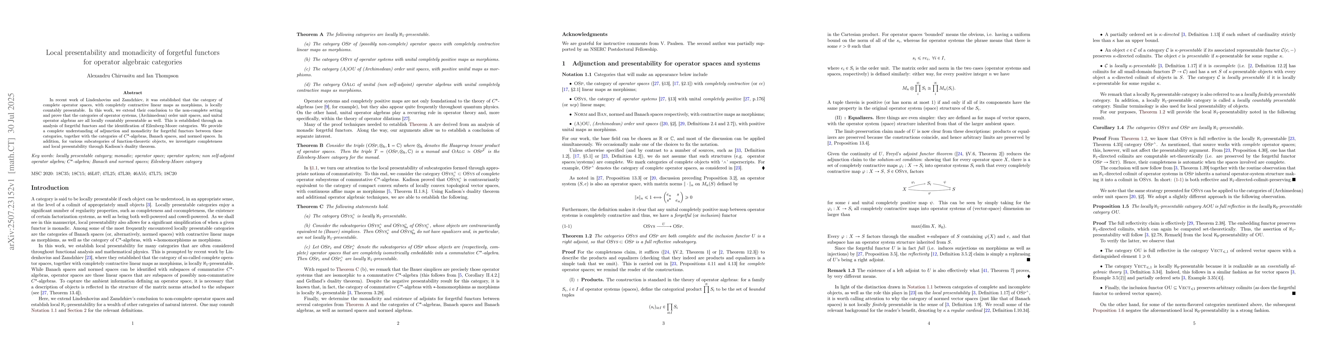 In recent work of Lindenhovius and Zamdzhiev, it was established that the category of complete operator spaces, with completely contractive linear maps as morphisms, is locally countably presentable. In this work, we extend their conclusion to the non-complete setting and prove that the categories of operator systems, (Archimedean) order unit spaces, and unital operator algebras are all locally countably presentable as well. This is established through an analysis of forgetful functors and the identification of Eilenberg-Moore categories. We provide a complete understanding of adjunction and monadicity for forgetful functors between these categories, together with the categories of $C^*$-algebras, Banach spaces, and normed spaces. In addition, for various subcategories of function-theoretic objects, we investigate completeness and local presentability through Kadison's duality theorem.