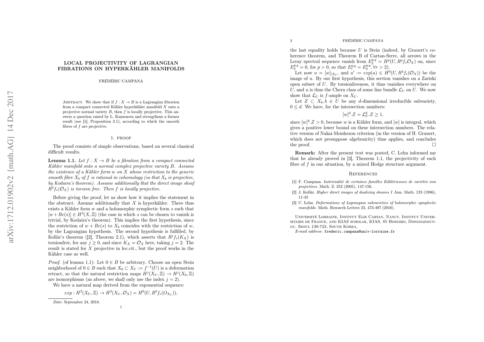 Summary: The paper demonstrates that a Lagrangian fibration from a compact connected Kähler hyperkähler manifold to a projective normal variety is locally projective, resolving a question by L. Kamenova and enhancing a prior result on the projectivity of smooth fibers without relying on additional context-specific results.