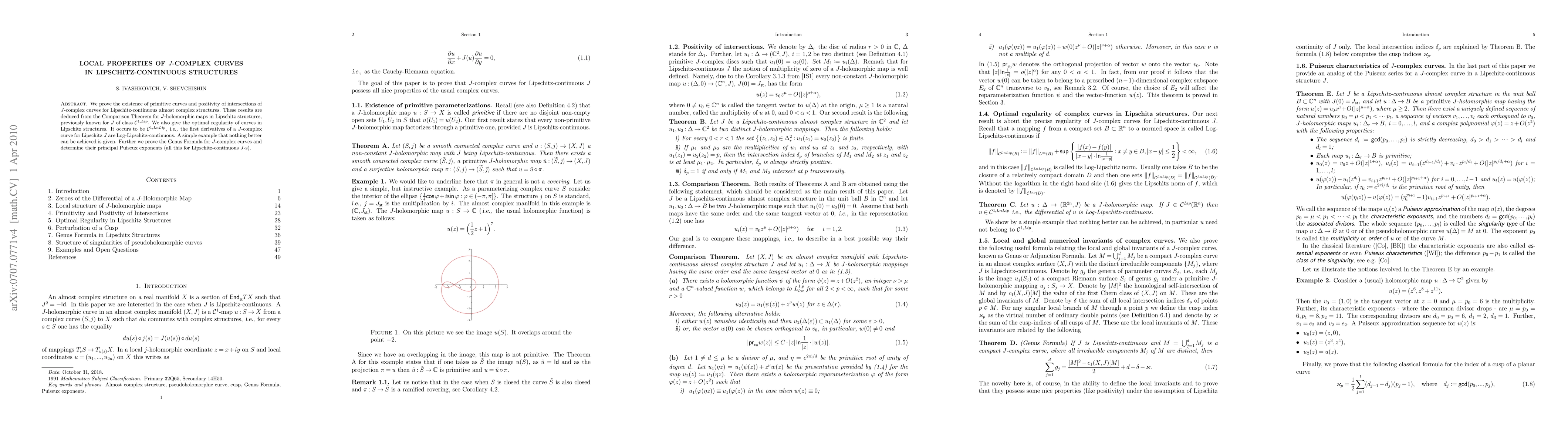 We prove the existence of primitive curves and positivity of intersections of $J$-complex curves for Lipschitz-continuous almost complex structures. These results are deduced from the Comparison Theorem for $J$-holomorphic maps in Lipschitz structures, previously known for $J$ of class $C^{1, Lip}$. We also give the optimal regularity of curves in Lipschitz structures. It occurs to be $C^{1,LnLip}$, i.e. the first derivatives of a $J$-complex curve for Lipschitz $J$ are Log-Lipschitz-continuous. A simple example that nothing better can be achieved is given. Further we prove the Genus Formula for $J$-complex curves and determine their principal Puisieux exponents (all this for Lipschitz-continuous $J$-s).
