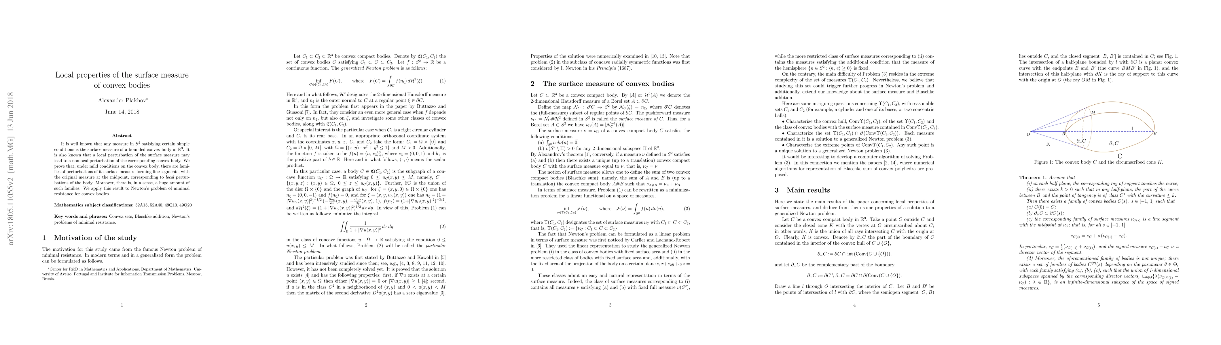 It is well known that any measure in S^2 satisfying certain simple conditions is the surface measure of a bounded convex body in R^3. It is also known that a local perturbation of the surface measure may lead to a nonlocal perturbation of the corresponding convex body. We prove that, under mild conditions on a convex body, there are families of perturbations of its surface measure forming line segments, with the original measure at the midpoint, leading to local perturbations of the body. Moreover, there is, in a sense, a huge amount of such families. We apply this result to Newton's problem of minimal resistance for convex bodies.