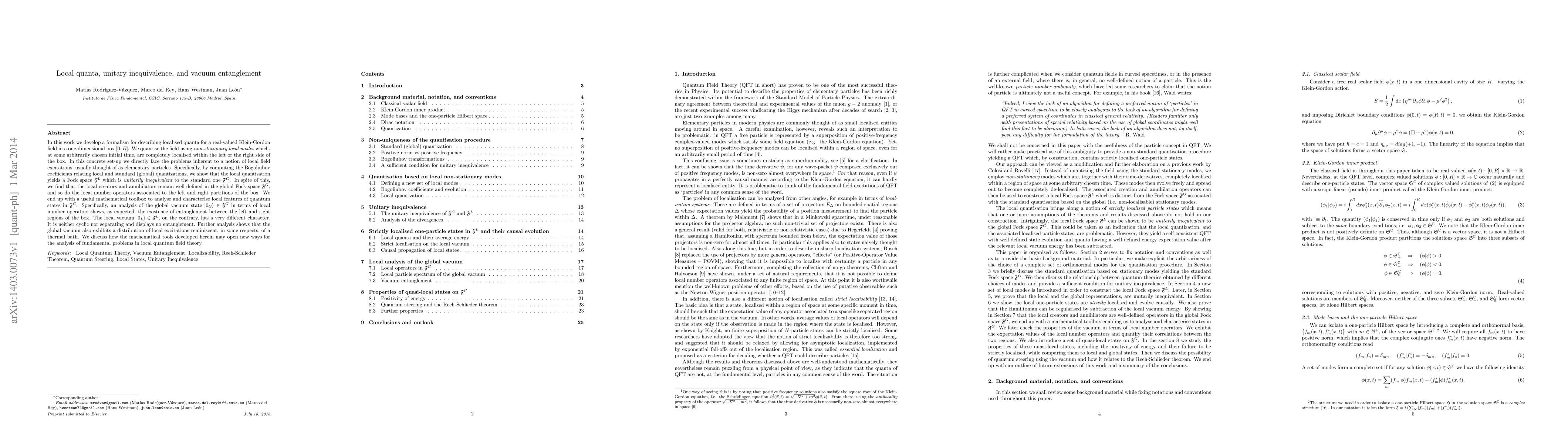 In this work we develop a formalism for describing localised quanta for a real-valued Klein-Gordon field in a one-dimensional box $[0, R]$. We quantise the field using non-stationary local modes which, at some arbitrarily chosen initial time, are completely localised within the left or the right side of the box. In this concrete set-up we directly face the problems inherent to a notion of local field excitations, usually thought of as elementary particles. Specifically, by computing the Bogoliubov coefficients relating local and standard (global) quantizations, we show that the local quantisation yields a Fock space $\mathfrak F^L$ which is unitarily inequivalent to the standard one $\mathfrak F^G$. In spite of this, we find that the local creators and annihilators remain well defined in the global Fock space $\mathfrak F^G$, and so do the local number operators associated to the left and right partitions of the box. We end up with a useful mathematical toolbox to analyse and characterise local features of quantum states in $\mathfrak F^G$. Specifically, an analysis of the global vacuum state $|0_G\rangle\in\mathfrak F^G$ in terms of local number operators shows, as expected, the existence of entanglement between the left and right regions of the box. The local vacuum $|0_L\rangle\in\mathfrak F^L$, on the contrary, has a very different character. It is neither cyclic nor separating and displays no entanglement. Further analysis shows that the global vacuum also exhibits a distribution of local excitations reminiscent, in some respects, of a thermal bath. We discuss how the mathematical tools developed herein may open new ways for the analysis of fundamental problems in local quantum field theory.