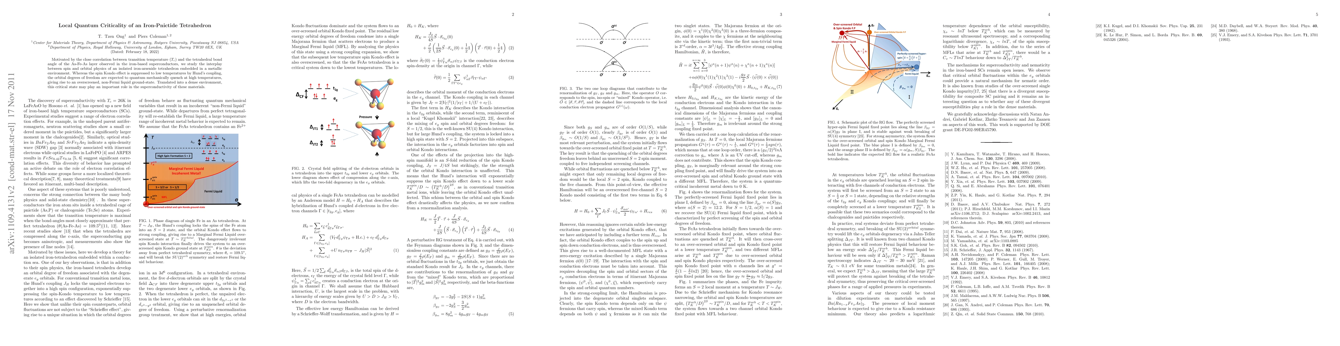 Motivated by the close correlation between transition temperature ($T_c$) and the tetrahedral bond angle of the As-Fe-As layer observed in the iron-based superconductors, we study the interplay between spin and orbital physics of an isolated iron-arsenide tetrahedron embedded in a metallic environment. Whereas the spin Kondo effect is suppressed to low temperatures by Hund's coupling, the orbital degrees of freedom are expected to quantum mechanically quench at high temperatures, giving rise to an overscreened, non-Fermi liquid ground-state. Translated into a dense environment, this critical state may play an important role in the superconductivity of these materials.