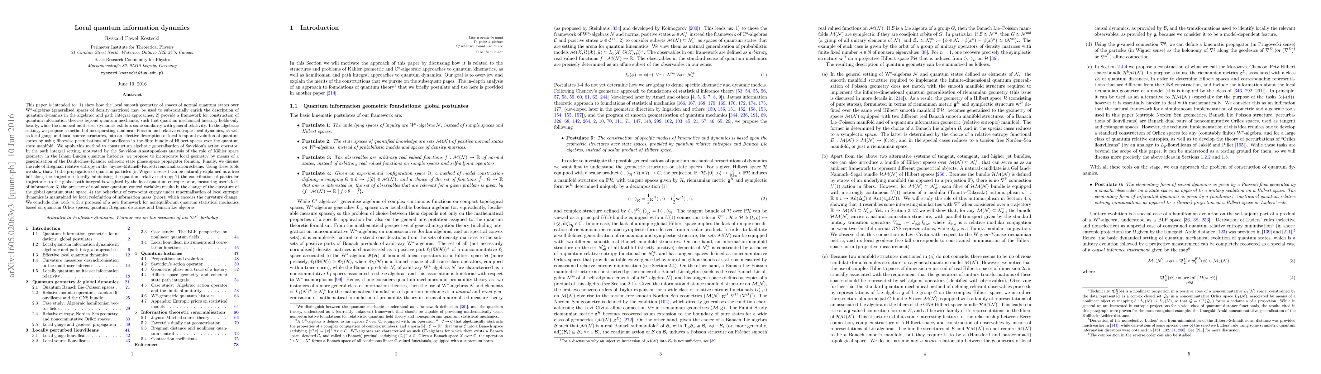 In this paper we: 1) show how the smooth geometry of spaces of normal quantum states over W*-algebras (generalised spaces of density matrices) may be used to substantially enrich the description of quantum dynamics in the algebraic and path integral approaches; 2) discuss a framework for postquantum information theories, such that quantum mechanical linearity holds only locally, while the nonlocal multi-user dynamics exhibits some similarity with general relativity. In the algebraic setting, we propose a method of incorporating nonlinear Poisson and relative entropic local dynamics, as well as local gauge and local source structures, into an effective description of local temporal evolution of quantum states by using fibrewise perturbations of liouvilleans in the fibre bundle of Hilbert spaces. In the path integral setting, we incorporate local geometry by a generalisation of the Daubechies--Klauder coherent state phase space propagator formula. Finally, we discuss the role of Bregman relative entropy in the Jaynes--Mitchell--Favretti renormalisation scheme. As a result, we show that: 1) the propagation of quantum particles (in Wigner's sense) can be naturally explained as a free fall along the trajectories locally minimising the quantum relative entropy; 2) the contribution of particular trajectories to the global path integral is weighted by the local quantum entropic prior, measuring user's lack of information; 3) the presence of nonlinear quantum control variables results in the change of the curvature of the global quantum state space; 4) the behaviour of zero-point energy under renormalisation of local entropic dynamics is maintained by local redefinition of information mass (prior), which encodes the curvature change. This leads us to a new framework for nonequilibrium quantum statistical mechanics based on quantum Orlicz spaces, quantum Bregman distances and Banach Lie algebras.