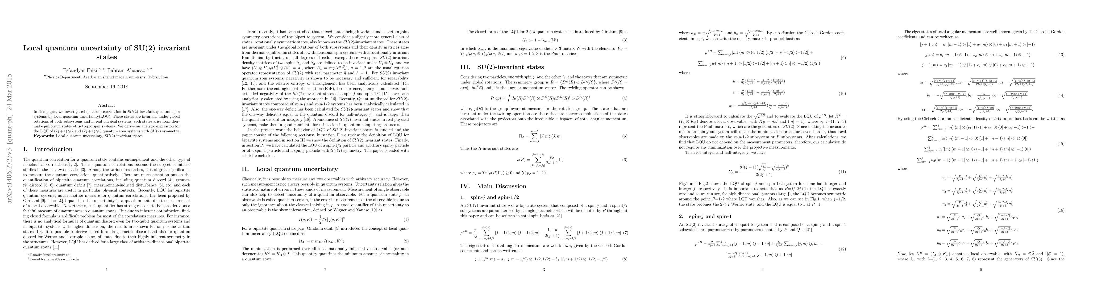 This paper investigates quantum correlations in SU(2) invariant spin systems using local quantum uncertainty (LQU), deriving an analytic expression for LQU in (2j +1)*2 and (2j +1)*3 quantum spin systems with SU(2) symmetry, relevant to thermal equilibrium states of isotropic spin systems.